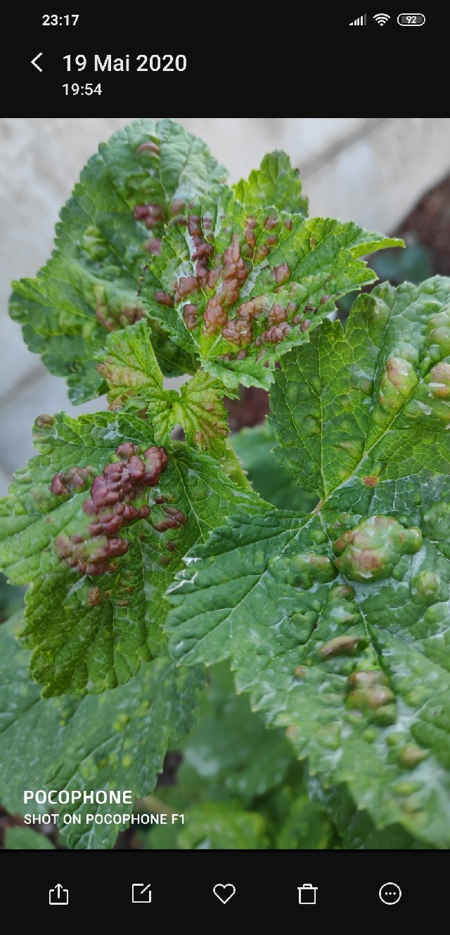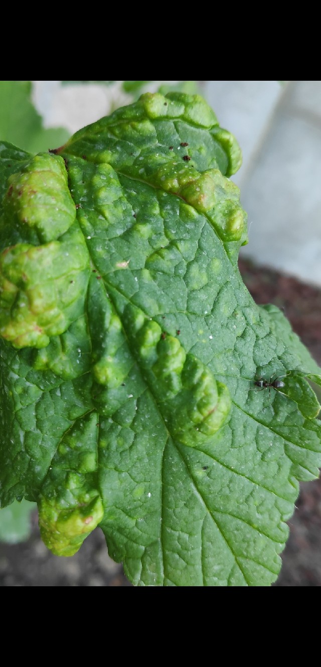 Et sur un groseillier, les feuilles ont changé de couleur, dont certaines où les fourmis se cachent en dessous.
