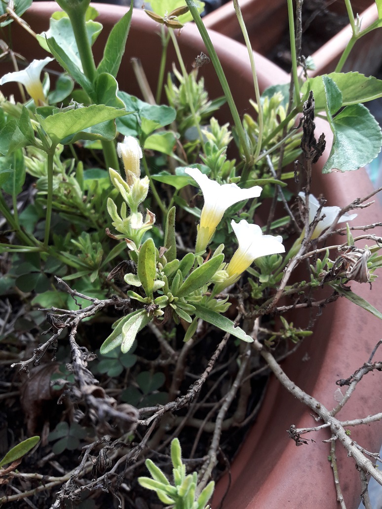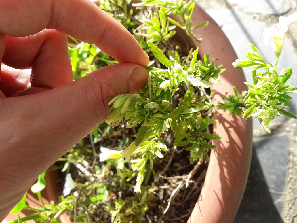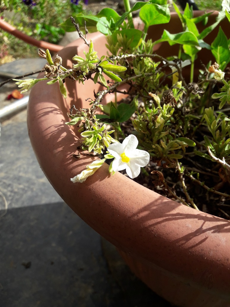 Ça fait 2 ans que cette plante est présente dans ce grand pot alors que c'est censé être une annuelle... car c'est bien une Calibrachoa à fleurs blanches et avec des feuilles étrangement étroites.