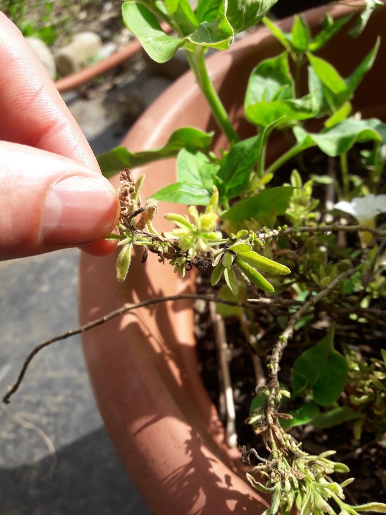 Ce que je pense voir aussi pousser dans le pot, ce sont des Mirabilis jalapa, autrement dit belle de nuit. La belle de nuit d'origine est-elle vraiment morte ou son feuillage a-t'il disparu pour la période hivernale ? Là ce sont soit des repousses de la plante d'origine, soit de nouvelles plantes à partir de toutes les graines tombées dans le pot. Tout ce monde là va avoir du mal à vivre dans ce pot, la petite va être étouffée.