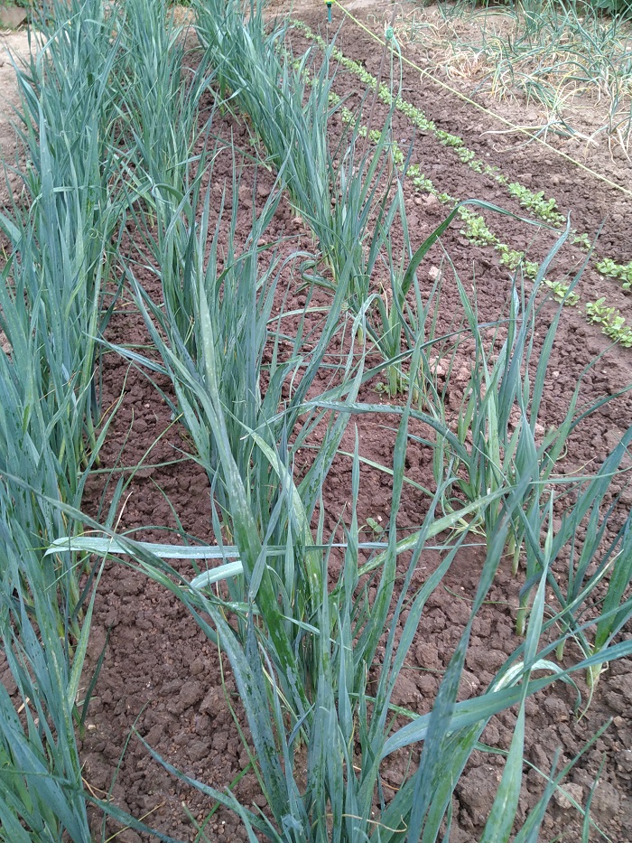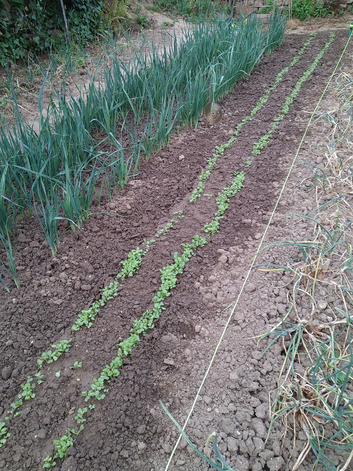 En place 2 routes d'oignons 1 route d'échalote 2 routes de petit pois repiquage de pieds de courges et potimarrons