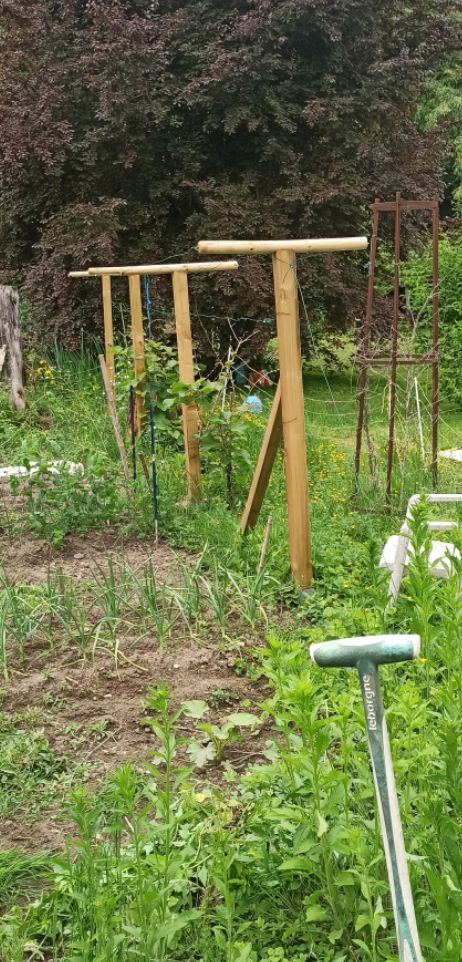 Voilà mon installation pour des kiwis issus de semis : poteaux bois tenus à chaque bout et jambes de force bois de chaque côté vers l'intérieur