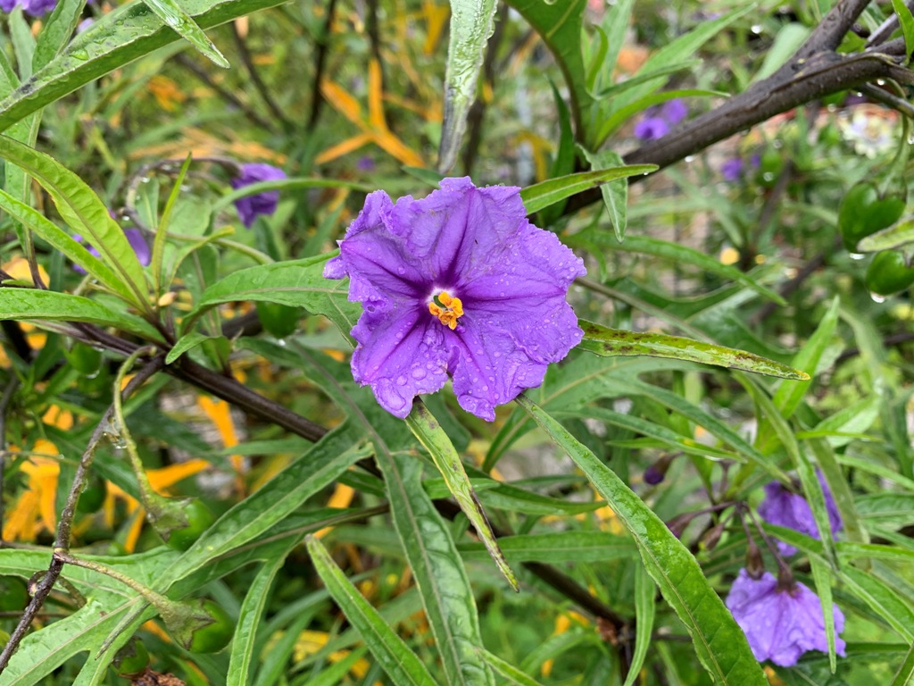 Les fleurs violettes sont typiques des solanum pas de doute je dirais morelle des oiseaux solanum aviculare ou lancinatum je sais plus lequel est en vigueur