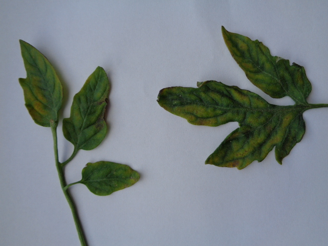 certaines feuilles de tomates ont ces taches jaunes diffuses sur le dessus et c'est plutot marron-violet au dessous. (photos 1 dessus - 1 dessous)