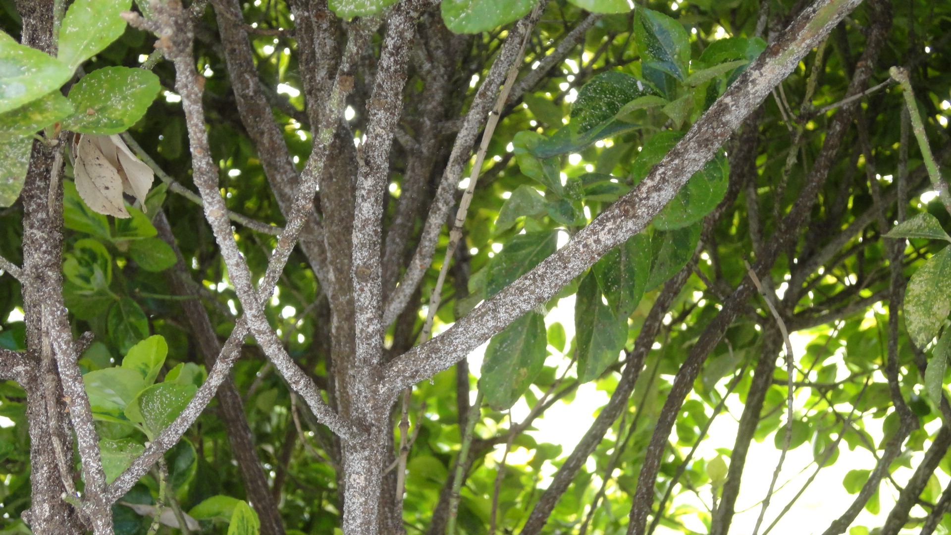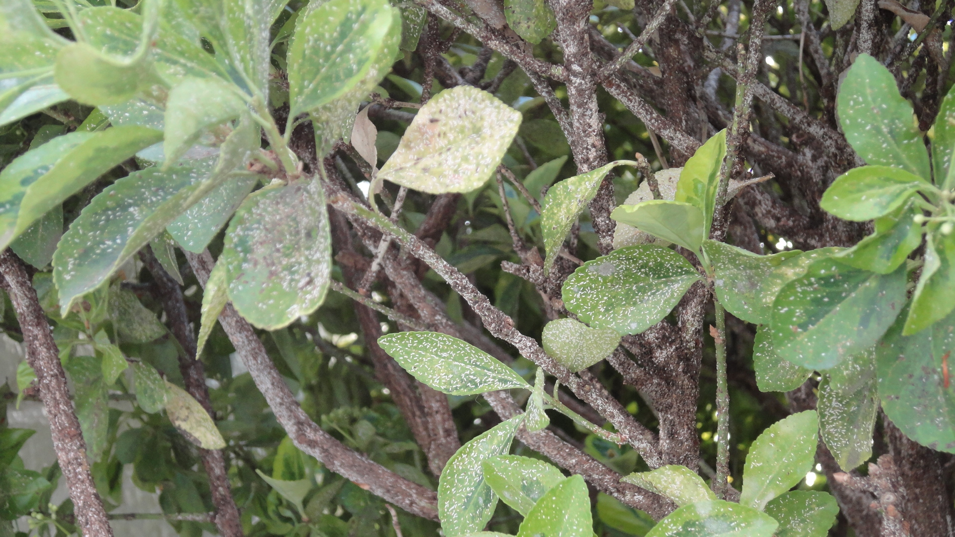 J'ai un weigelia (correction : je pense plutôt que c'est un fusain du Japon d'après les images Google) qui est infesté depuis 2-3 ans par un parasite que je n'arrive pas à identifier. J'ai fait des recherches sur internet, et je peux déjà dire qu'il ne s'agit pas de mouches blanches (aleurodes) et que c'est trop petit pour être des cochenilles (et les cochenilles ont des antennes et sont poilues d'après les photos Google). Cela ressemble à de petites larves blanches de 1-2mm collées aux feuilles et aux branches, et qui ne partent pas lorsque je les asperges avec de l'eau ou du savon noir. J'ai regardé au microscope et cela ressemble vraiment à des larves ou de petits vers statiques (ne bougent pas et ne grossissent pas).
