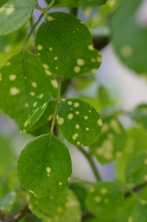 Comme si quelque chose avait été fait à proximité et que des gouttelettes de produit soient parties sur le rosier.