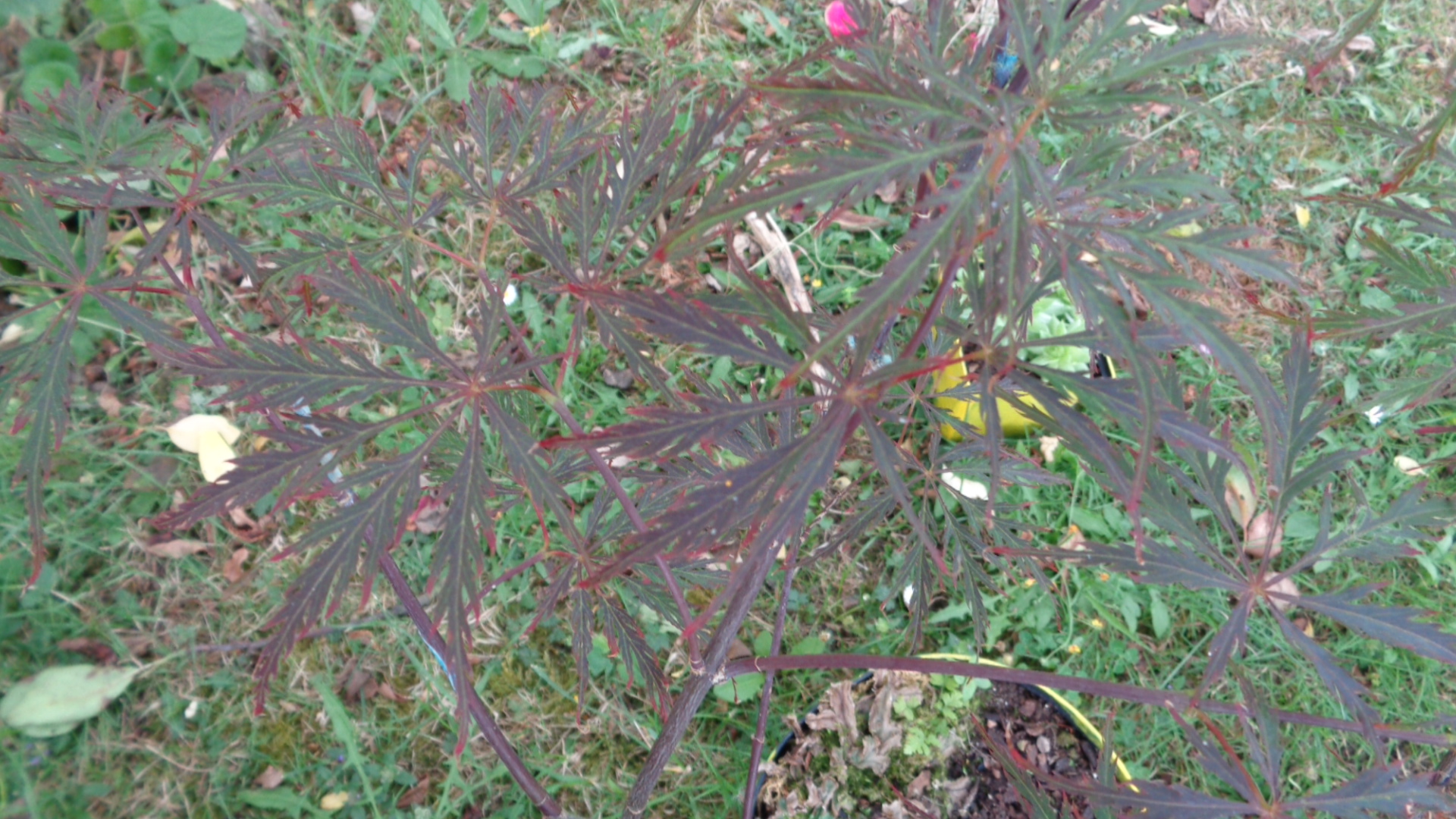 Bonsoir je vous présente mon petit acer dissectum Red Garnet arrivé cette année . Il est depuis cette année à l'ombre (mi-ombre) sous mon prunier ; quelques feuilles ont légèrement brulées mais vraiment rien de grave . Je l'aime déjà beaucoup . Il a l'air bien mais ne fait pas de pousse ; peux être veut-il de l'engrais ? Il était 3/4 vert quant je l'ai acheté puis il a pris une couleur qui me convient mieux aujourd'hui .