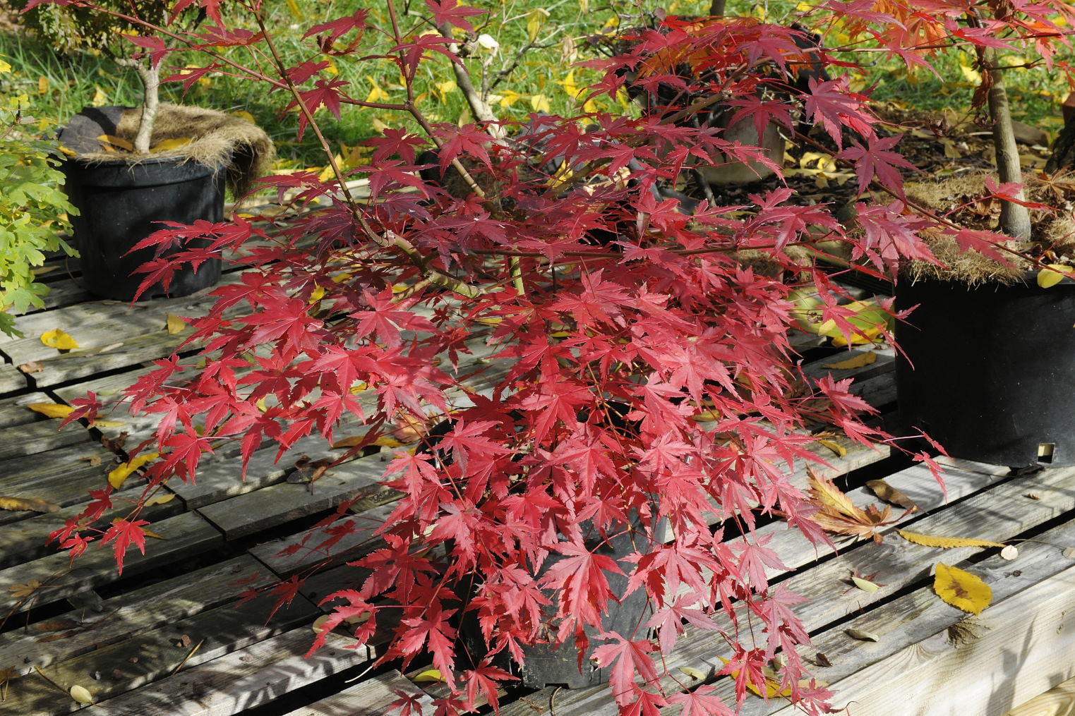 Jeune, il se colorait de jaune. C'est amusant d'avoir obtenu les trois Acer de la section Palmata par semis de graines prélevées à Kyoto et d'avoir ici sous les yeux la confirmation de ce que dit Yano de la coloration rouge de matsumurae qui ne se produit qu'à partir d'un certain âge.