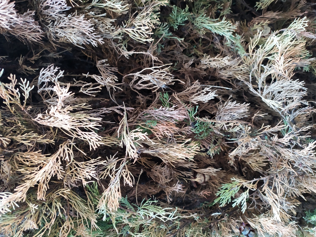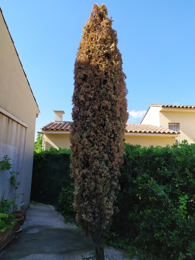 2 autres cyprès commencent à sécher, la haie de thuyas commence aussi à jaunir.