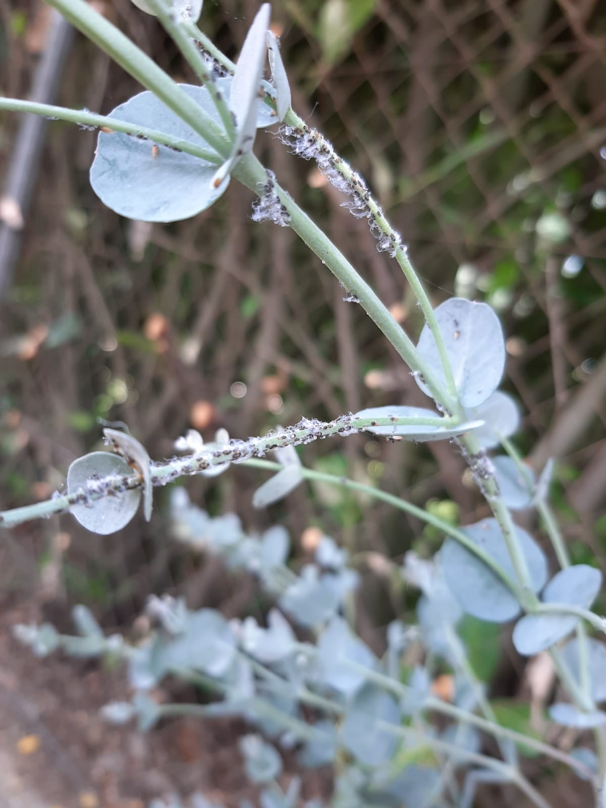 J'ai acheté cet eucalyptus en jardinerie et à présent l'ensemble des nouvelles pousses sont parasitées par un insecte noir de la taille d'un puceron, certains semble avoir des ailes marrons et cela forme une sorte de voile de coton.