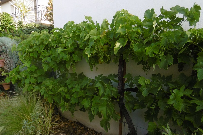 ma vigne que j'ai conduit sur 2 rang de hauteur contre un mur blanc , muscat de Hambourg
