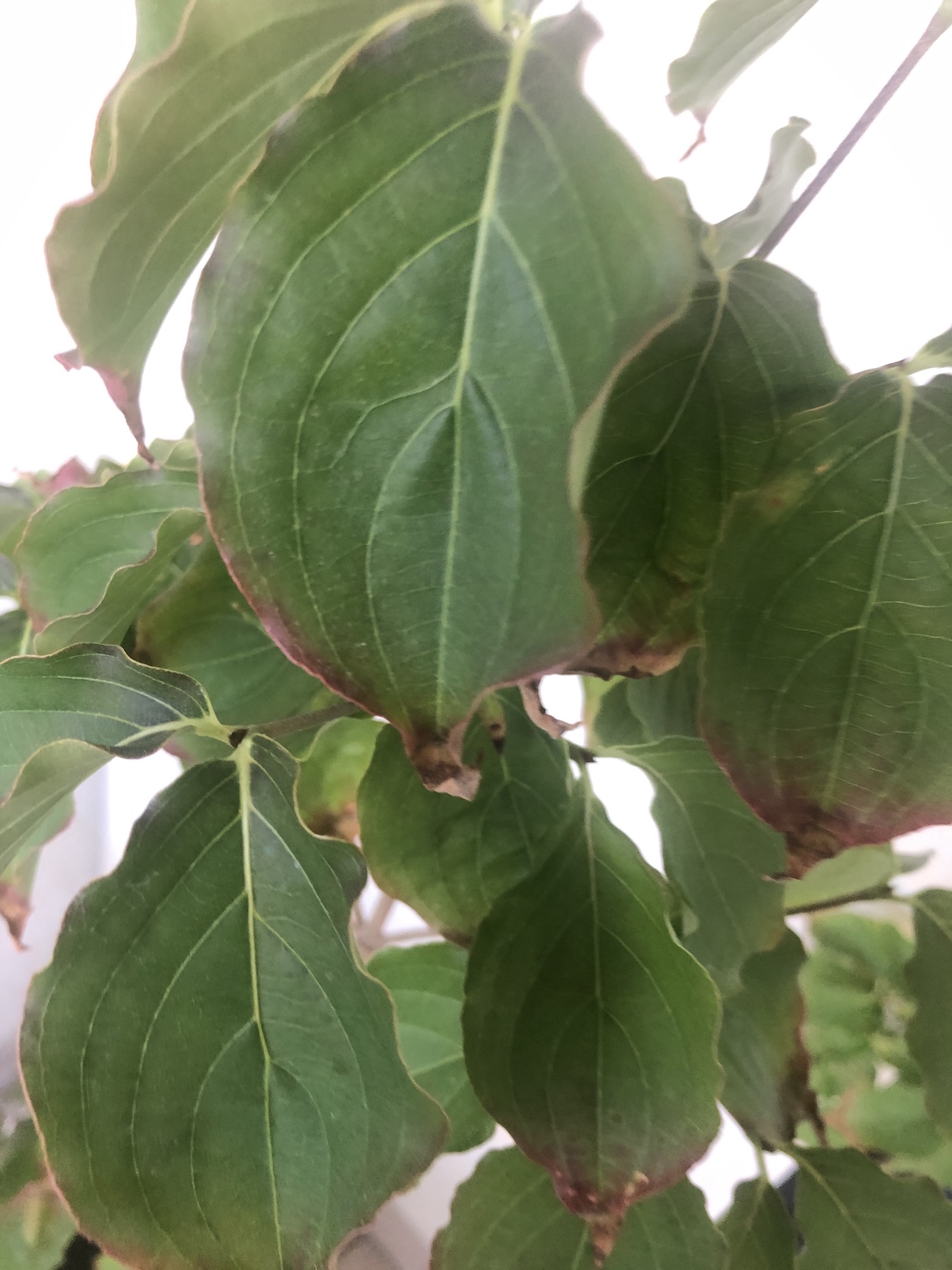 Les feuilles de mon cornus kousa qui est dans un pot de 40L de terre de bruyere sur un balcon plein sud (mais pas en plein soleil toute la journée, le balcon du dessus faisant de l'ombre une partie de la journée), à le bout des feuille qui noircisse.