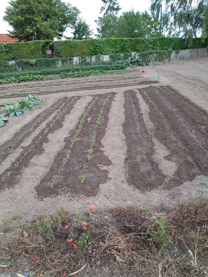 Au grand potager j'ai semé 7 routes de haricot jaune pour septembre ,bientôt la relève arrive "photos"