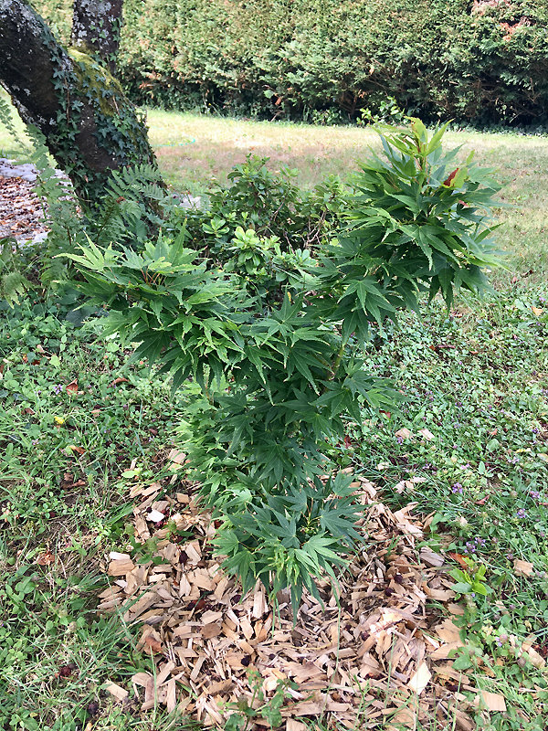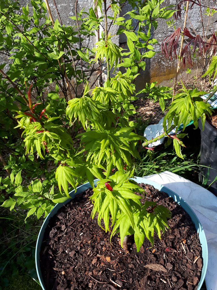 Un exemplaire acheté tout récemment, de 80cm environ, dans un pot de 40 L, encore jeune, pas plus de 5 ans, le débourrement n'est pas terminé… Je craque complètement pour ce cultivar, qui donne un mélange de couleurs à l'automne absolument fabuleux !
