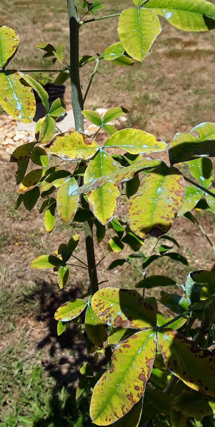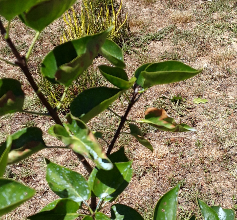 Son copain le syringa a cote a lui aussi des taches, comme ses voisins les lauriers roses qui ont les feuilles qui deviennet jaunes et marron egalement.