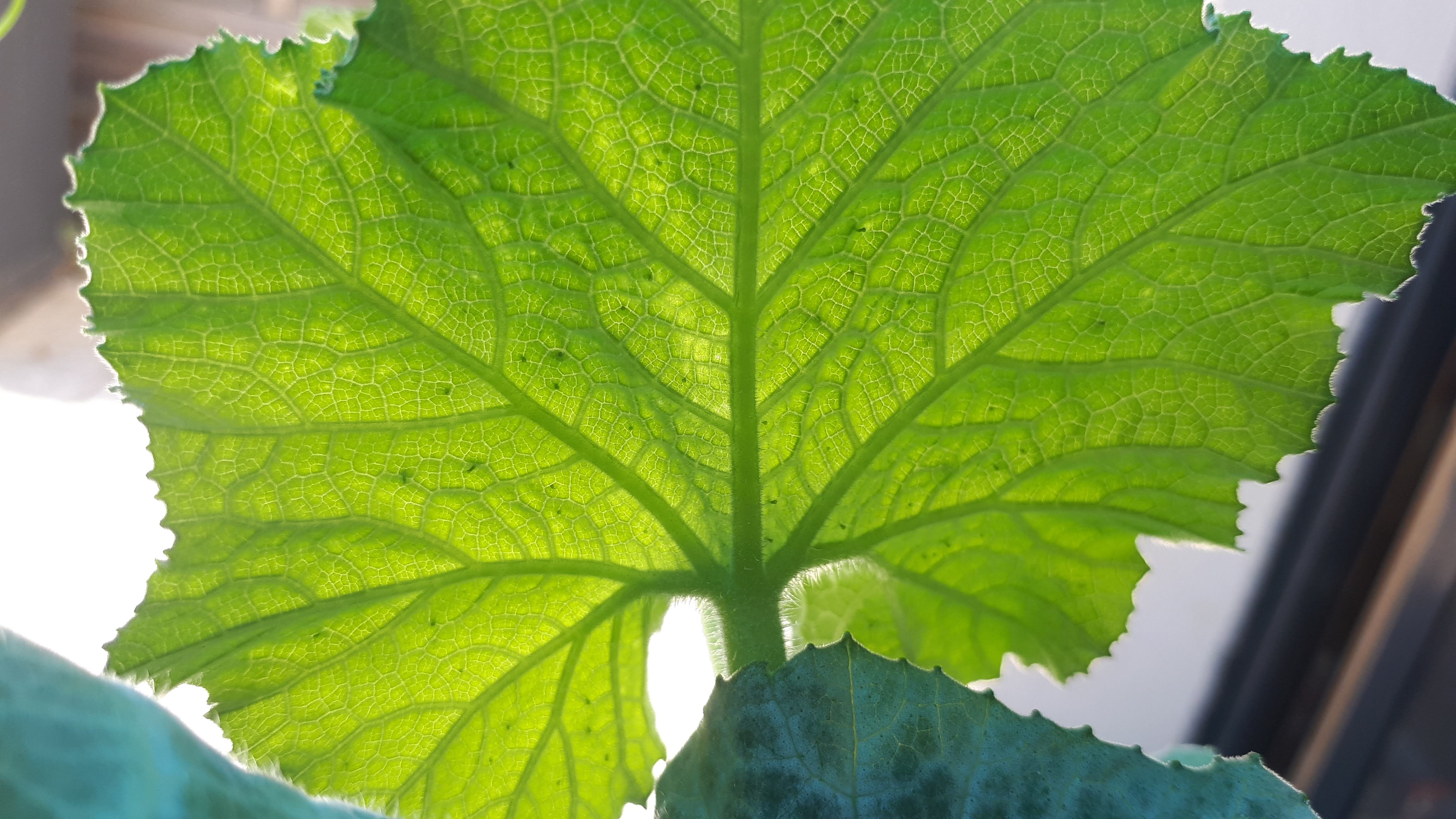 Du coup, ce matin, je m'attelle à ma tâche, et je traite chaque feuille avec de l'eau bien froide. Après avoir minutieusement observé chaque feuille, voici mon constat : aucune toile spécifique d'acariens, et rien qui ressemble à un acarien (pour moi, un acarien, c'est plus une araignée minuscule, non ?). En regardant sur internet, j'ai soupçonné l'argenture, j'ai donc cherché des mouches blanches, pas de mouche blanche visible (au stade adulte en tout cas), et rien qui s'envole quand je manipule les feuilles. Je n'ai vu que 2 bébêtes volantes de la taille d'un moucheron mais plutôt marron/noir rayé (cf photo 12-OVNI). Par contre, j'ai vu pas mal de ces petits grains de riz de 1mm de long... sous et sur les feuilles (cf photos 7-bebete, 8-bebete2, 9-bebete3, 10-bebete4, 11-bebete5). La plupart du temps blancs, mais j'en ai vu certains un peu plus dans les tons marron. Ceci dit, même si j'en ai vu pas mal, je ne qualifierai pas ça d'infestation, de ce que j'ai vu à l'oeil nu en tout cas. Du coup je me demande si ces petits trucs blancs, en si "petit" nombre, peuvent causer ça ? Et si oui, que sont ces bébêtes ? Des larves d'aleurodes ? Thrips ? Et que dois-je faire pour arrêter leur prolifération et sauver mon potiron ?