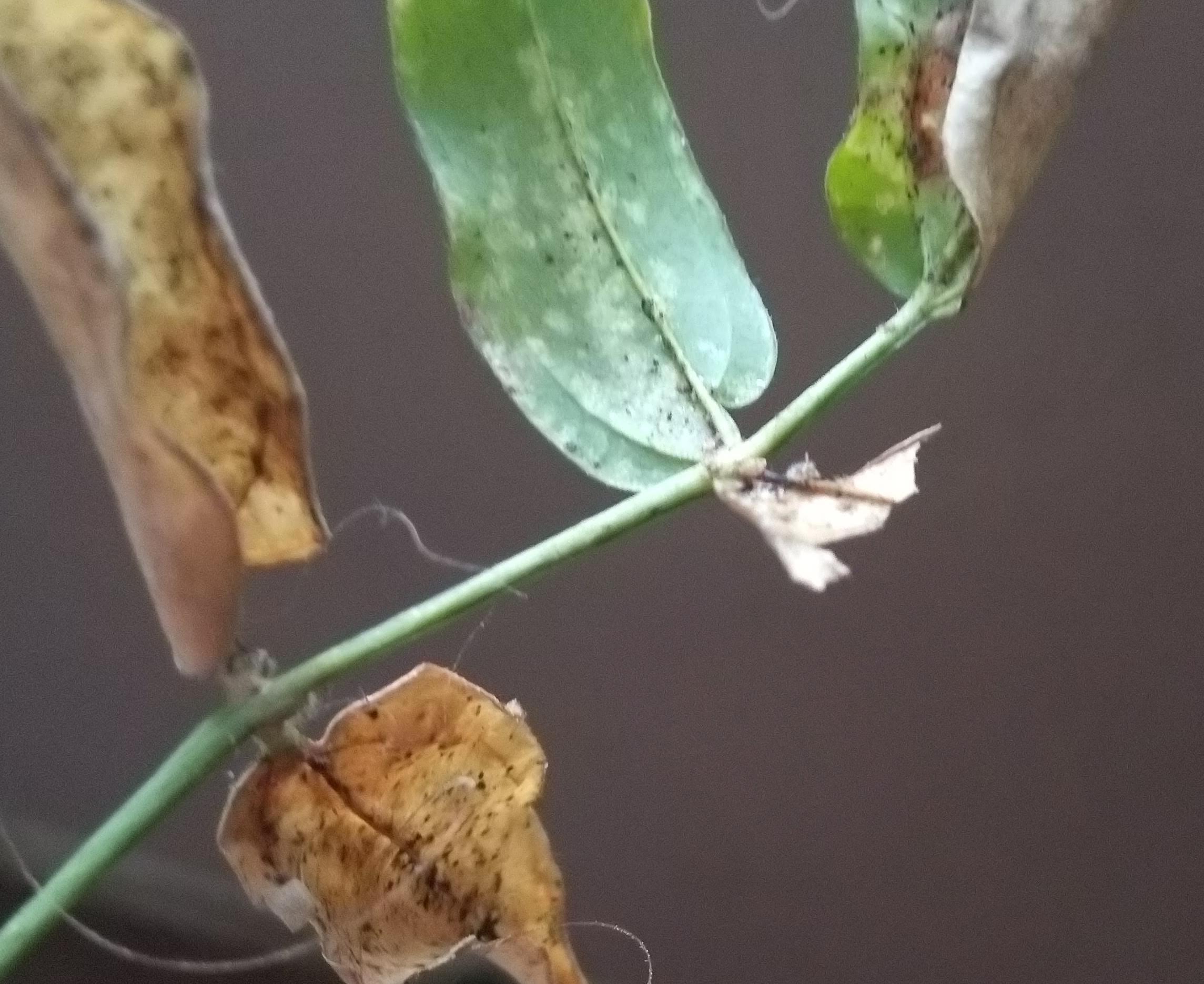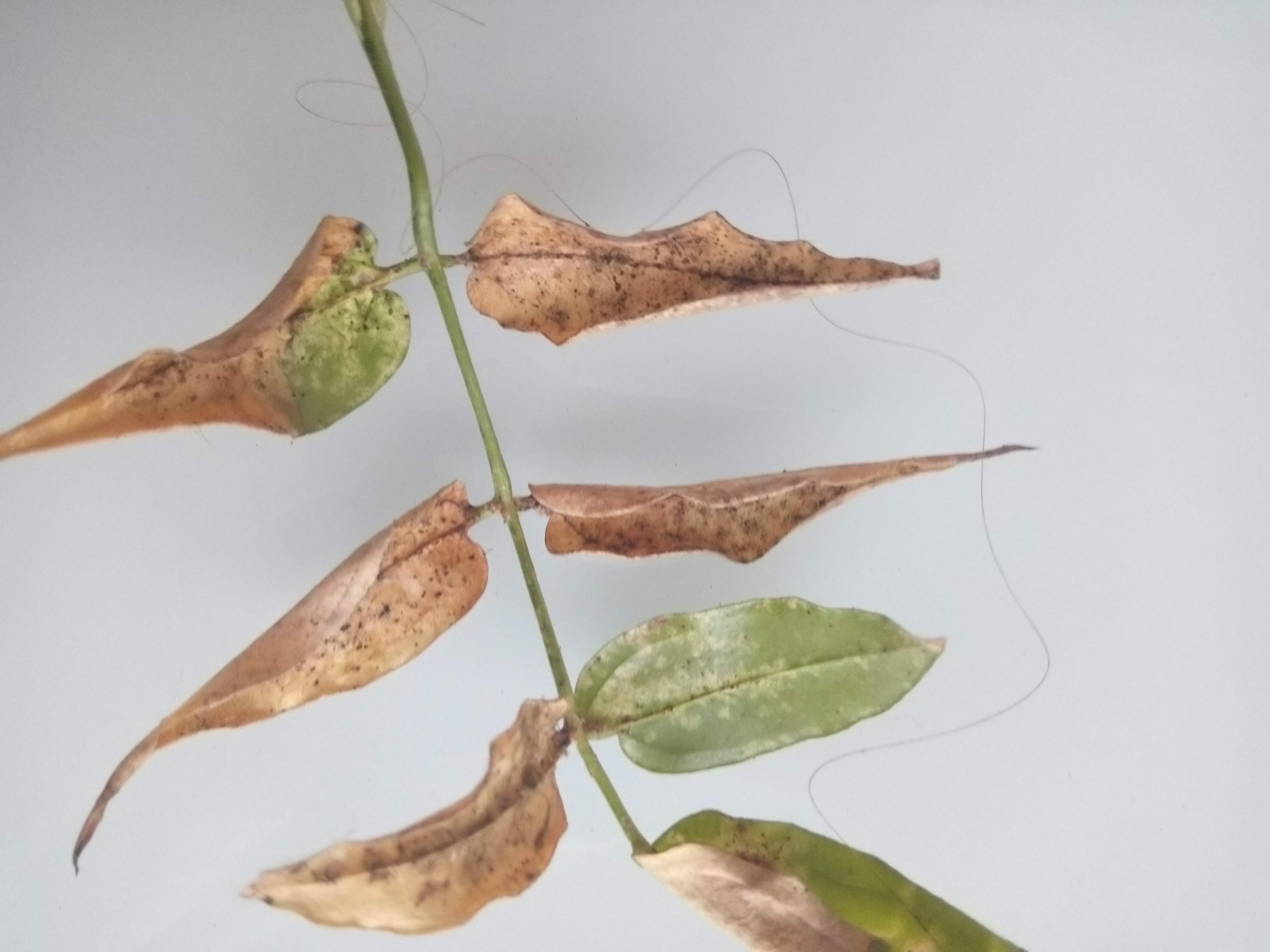 En gros les feuilles ont des tous petits points noirs et collent un peu puis sèchent et se recroquevillent.