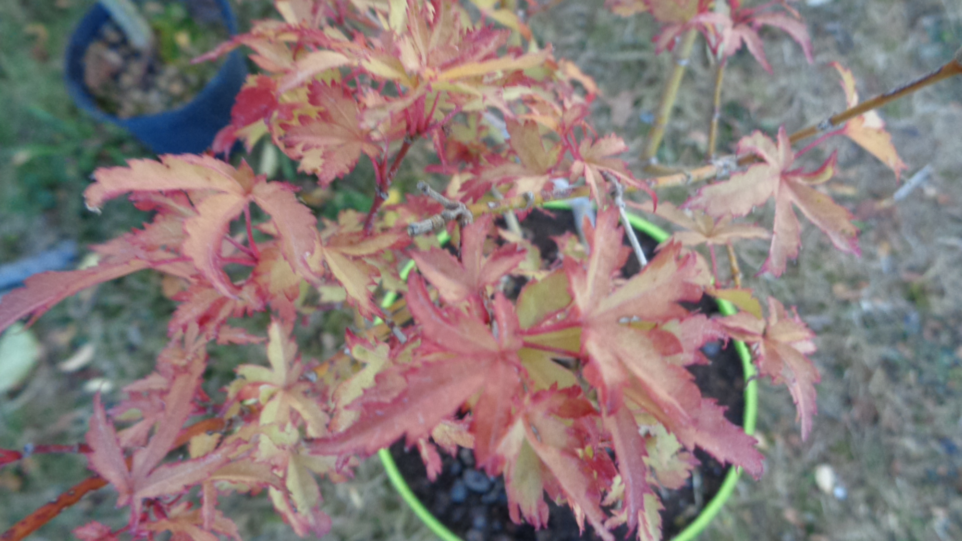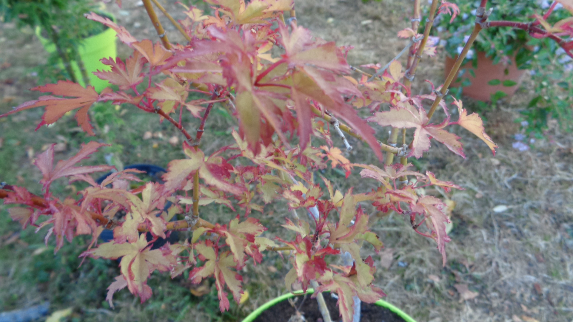 (8 éme érable acheté cette année !) . Je pense qu'il a déjà sa couleur d'automne , son feuillage a un peu souffert et pire son tronc (coup de soleil) . Voici quelques photos . Ce soir je l'ai rempoter dans 50% de pouzzolane et 50% de terreau et une poignet de fertilisant or brun . Ne vous fiez pas à ce que vous voyez à la surface ; c'est remplit de pouzzo en dessous . Et le fond du pot : 100% pouzzolane 4 centimètres d'épaisseur . J'ai oublier d'incorporer ma terre des bois , de la vraie . Le substrat d'origine était détrempé alors pas d'arrosage pour ce rempotage .