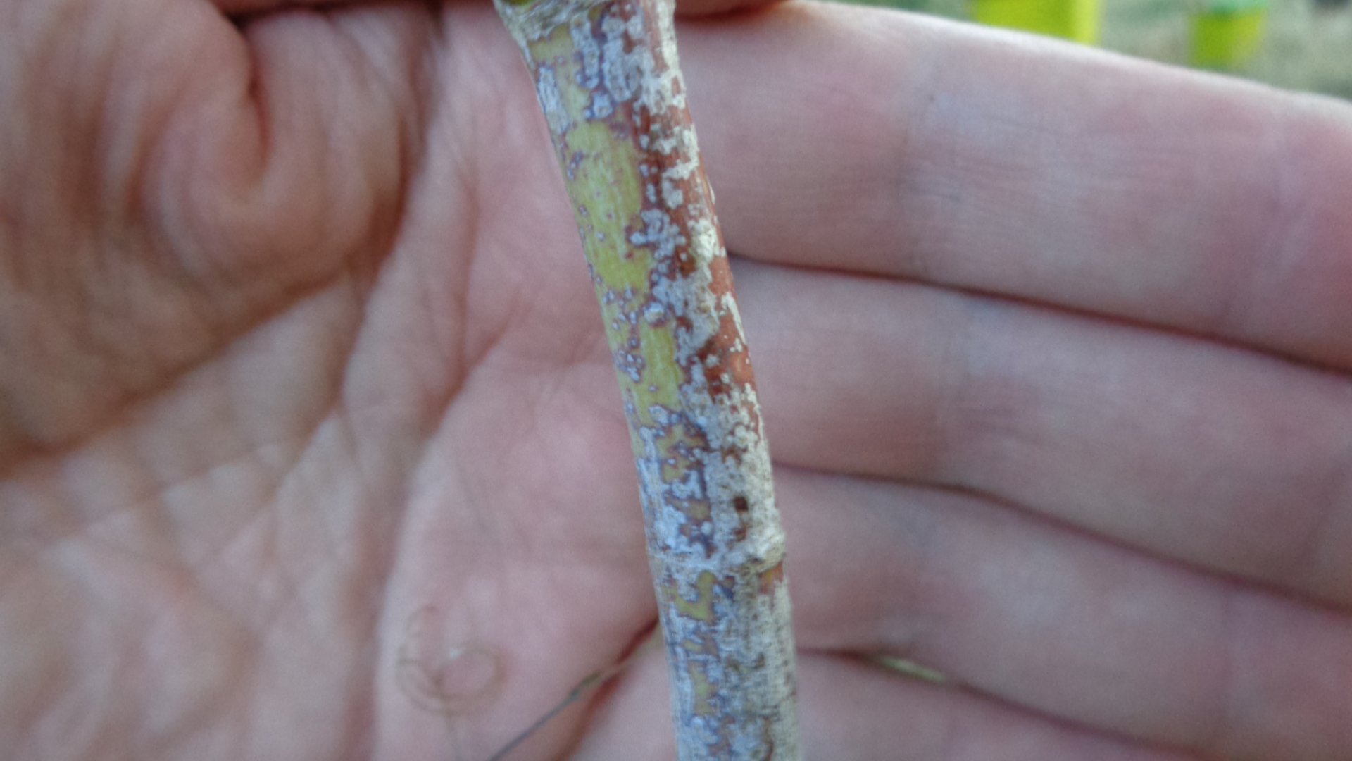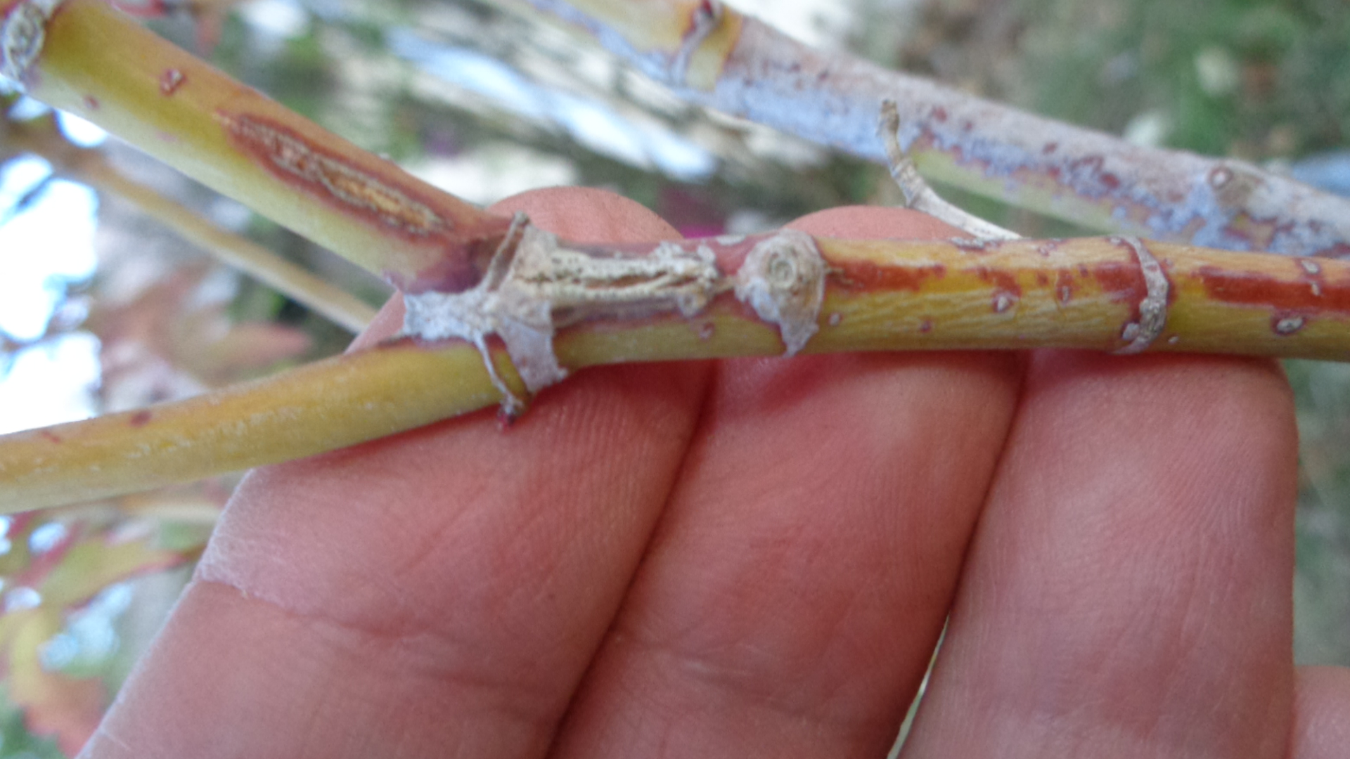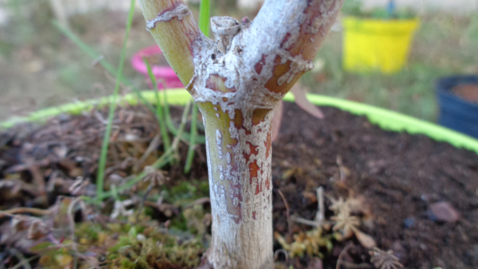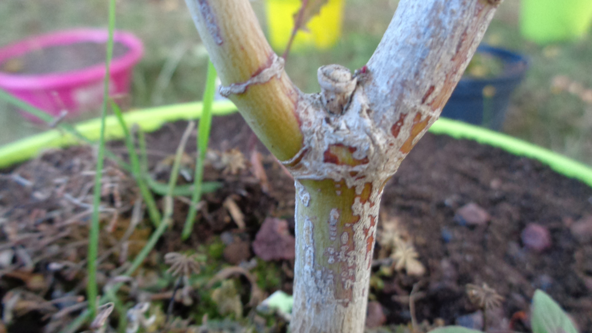 Bonjour à tous . Ce matin j'ai coupés les chicots et j'allais passer la bouillie bordelaise mais oh surprise . Un détail que je revois et qui m'interpelle un peu , voir beaucoup ? J'ai quelque photo d'une petite branche avec juste deux brindilles au dessus . J'ai un peu peur que ce soit la verticilliose , j'espère que non ... Je crois voir dans le creux des boursouflures de cicatrisation du moisi blanc ; ces choses sont même un peu partout sur les branches qui ont beaucoup de petites zones blanches . J'ai aussi vu une petite tache noir sur une branchette . Que penser de tout cela ?