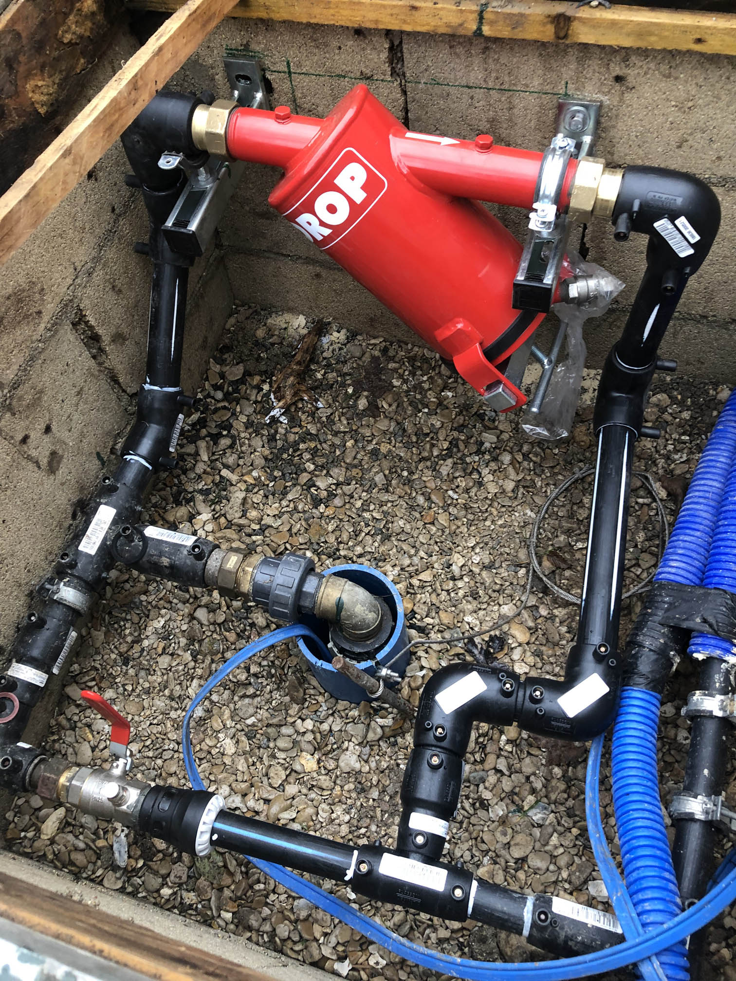Voici un exemple pour une installation (de cet hiver) remontant des particules fines (mais pas de sable grossier) : filtre Y en 40x49 sur canalisation de forage en 40 (puis réduite pour l'arrosage en 32) + By-pass (la vanne d'arrêt) en cas de colmatage du filtre ; j'ai commencé par une filtration à 219 microns et je mettrais une cartouche plus fine si elle ne suffit pas ; mais il faut attendre à l'usage, donc attendre plusieurs semaines, ou au moins que l'arrosage tourne un peu et le forage soit réellement en service (fait pas très beau sur l'île-de-France depuis le début de l'année).