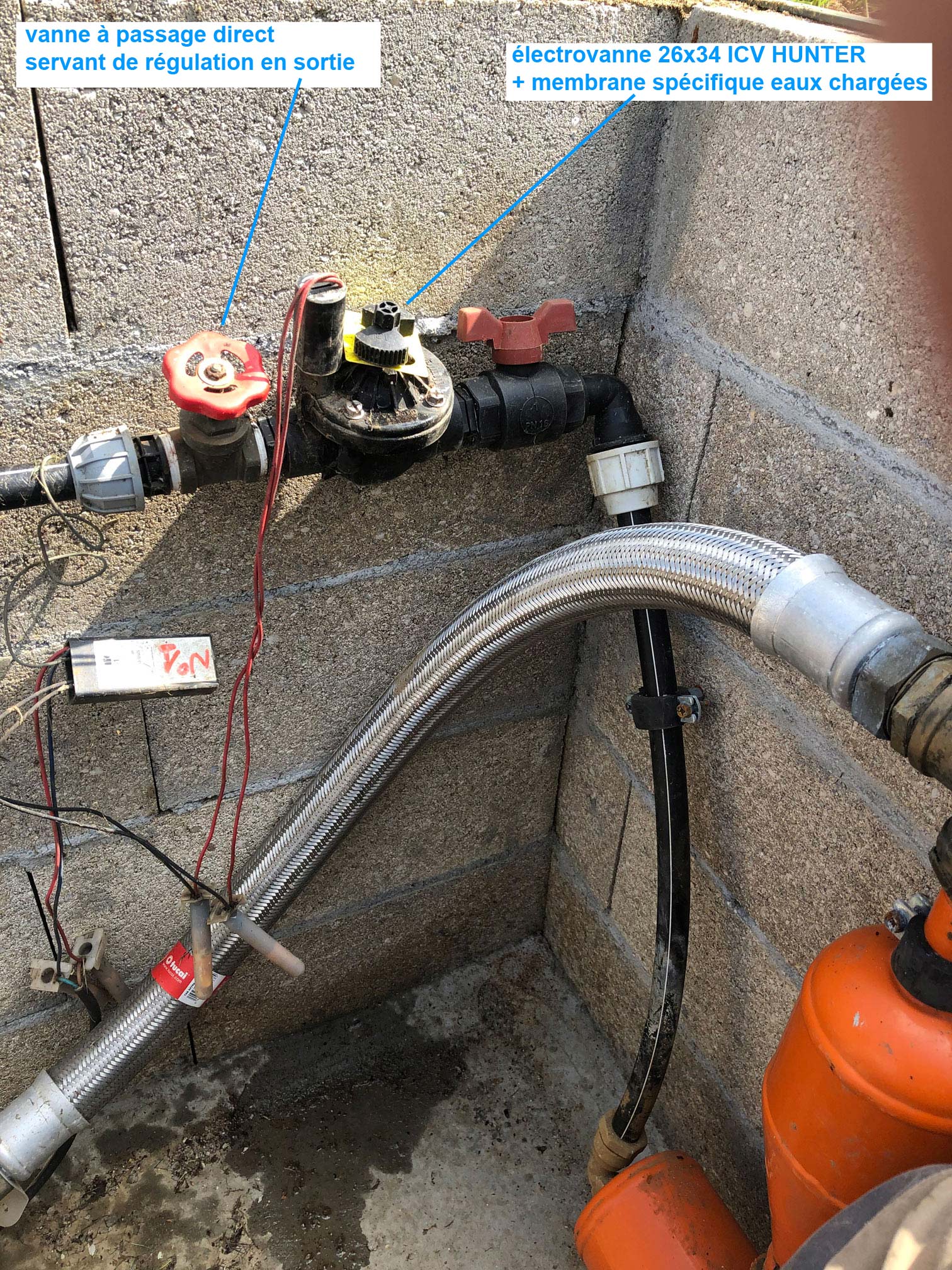 - Une électrovanne marque Hunter modèle ICV 100, "grosse pression", dans laquelle a été mis en place une membrane spécifique (dit "Filter Sentry") aux eaux chargées. Indispensable de changer la membrane.