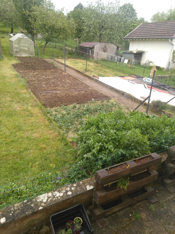 La terre était dure comme de la pierre, pas un ver qui passe par là, pas beaucoup d'autres bêbêtes non plus. Heureusement le compost est plein. Alors j'ai incorporé ça tant bien que mal. Je prévois de pailler aussi, il faut que j'aille rendre visite aux agriculteurs du coin. J'ai également des engrais verts en réserve pour éviter la réinfestation par les mauvaises herbes et enrichir le sol en même temps.