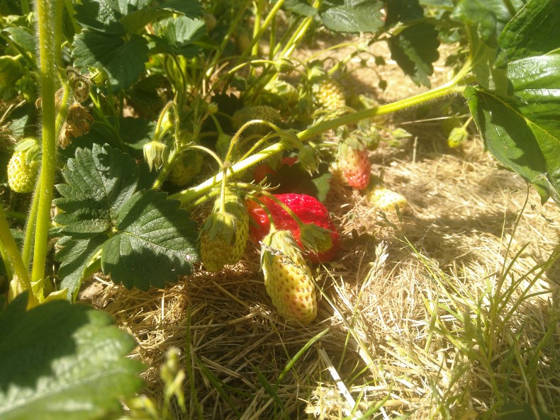 Quelques petites fraises font leur apparition, on a déjà pu en goûter l'une ou l'autre mais pas encore de quoi faire un bol... allez vite!