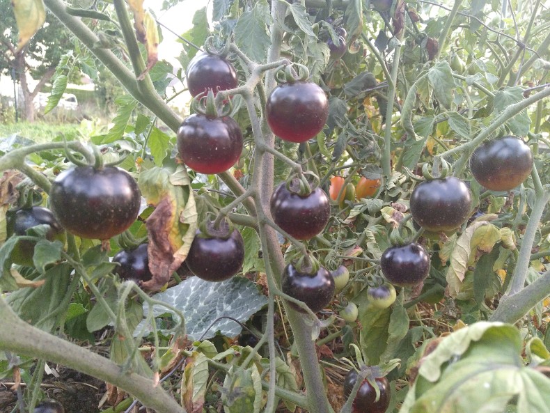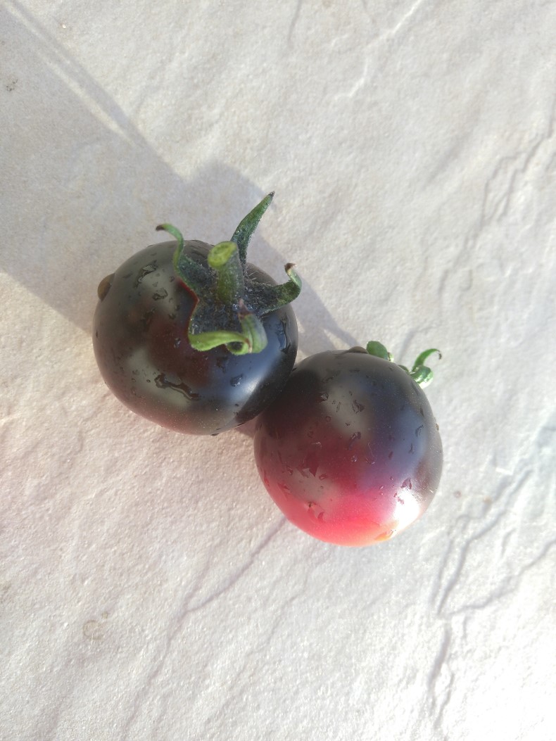 Les Tomates cocktail dont j'ai trouvé la variété (je pense) Indigo Rose. douces sans acidité contrairement aux blush qu'on voit derrière qui sont très acidulées à la peau extra croquante mmh