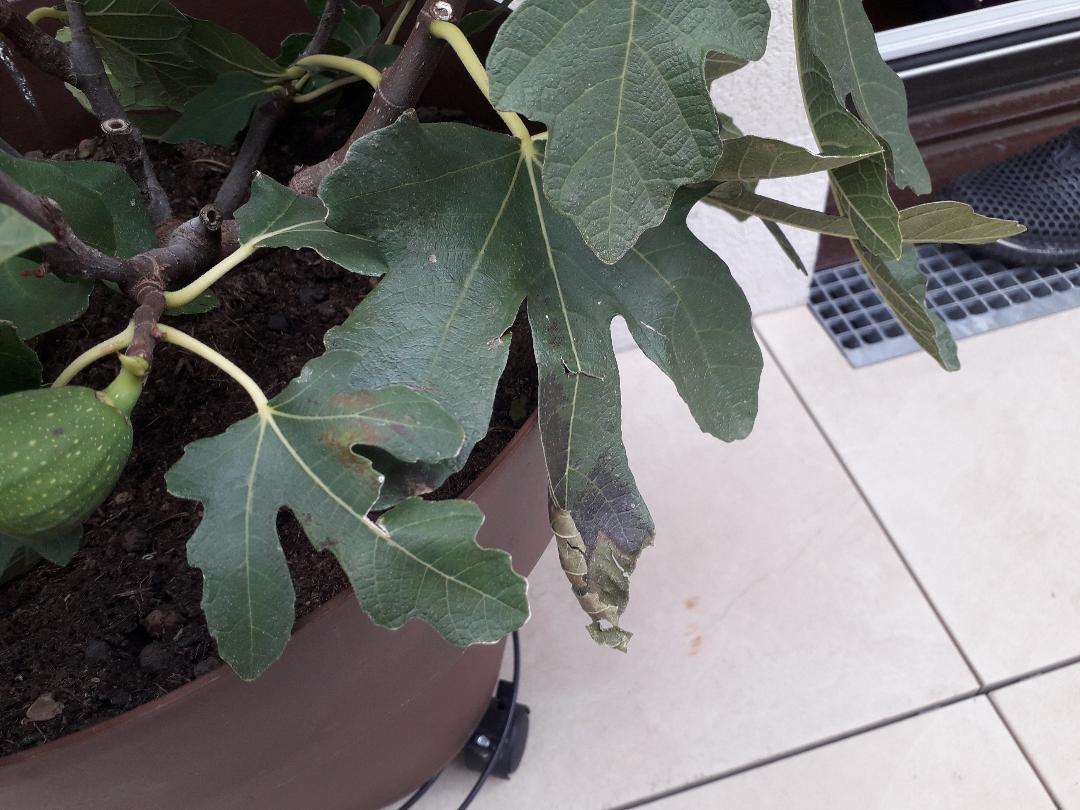 Ne t'inquiéte pas pour les tâches, j'ai la même chose sur mes figuiers en pot, et parfois aussi sur mes figuiers en terre, une carence peut-être ? Un manque d'humidité... Rien de grave en tout cas.