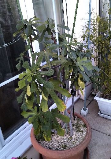 Depuis 3 ans, j'ai un figuier (variété figuier de Bordeaux) dans un grand pot: hauteur 1m. Je le taille tous les ans. Chaque année il nous régale de délicieuses figues (1 à 2 kg). Idem pour cette année. MAIS contrairement aux années précédentes, cette année il a commencé à perdre ses feuilles très tôt alors qu'il a encore des fruits en cours de maturation: voir photo.