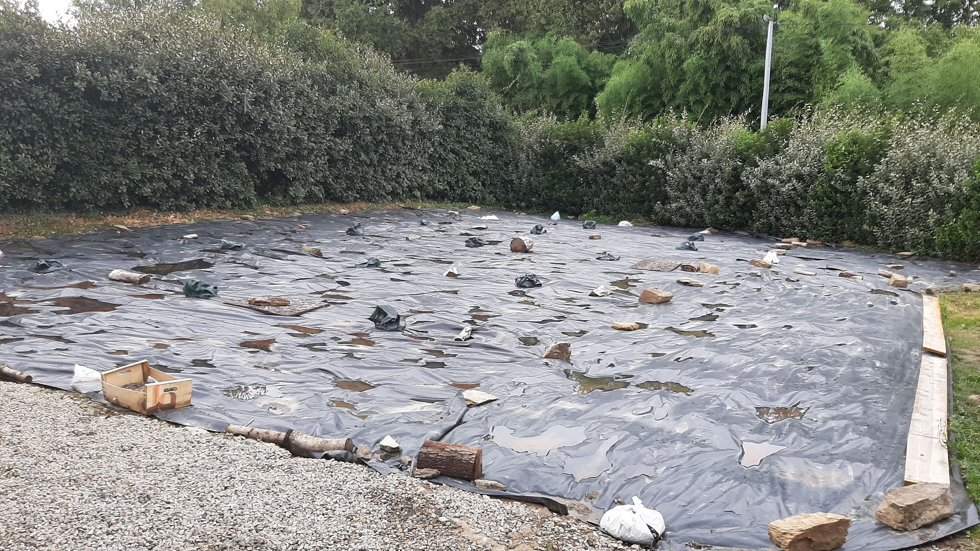 Nous avons donc retourné la terre de notre jardin début juin (fin des travaux), puis avons bâché afin de faire du désherbage et désinfection de sol par solarisation.