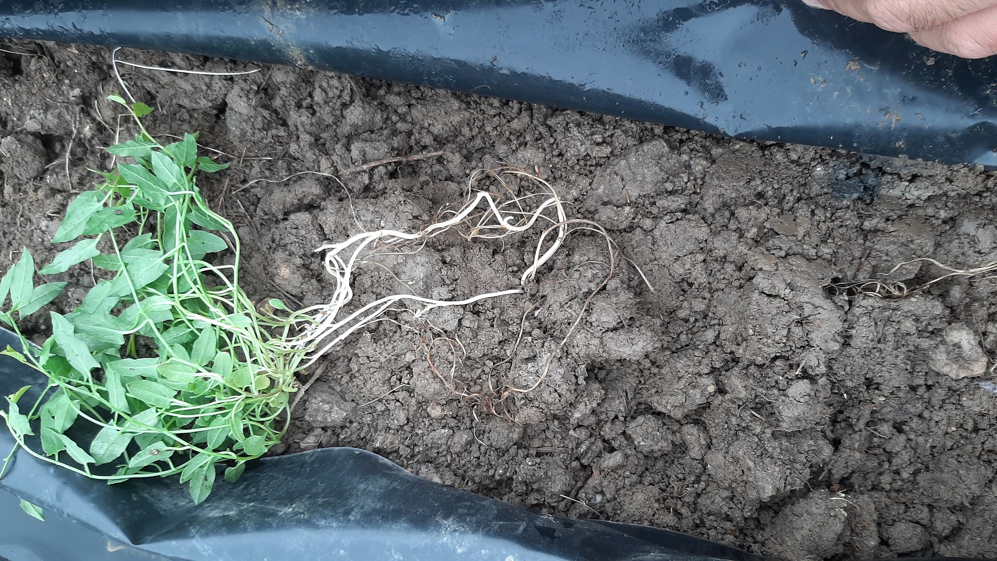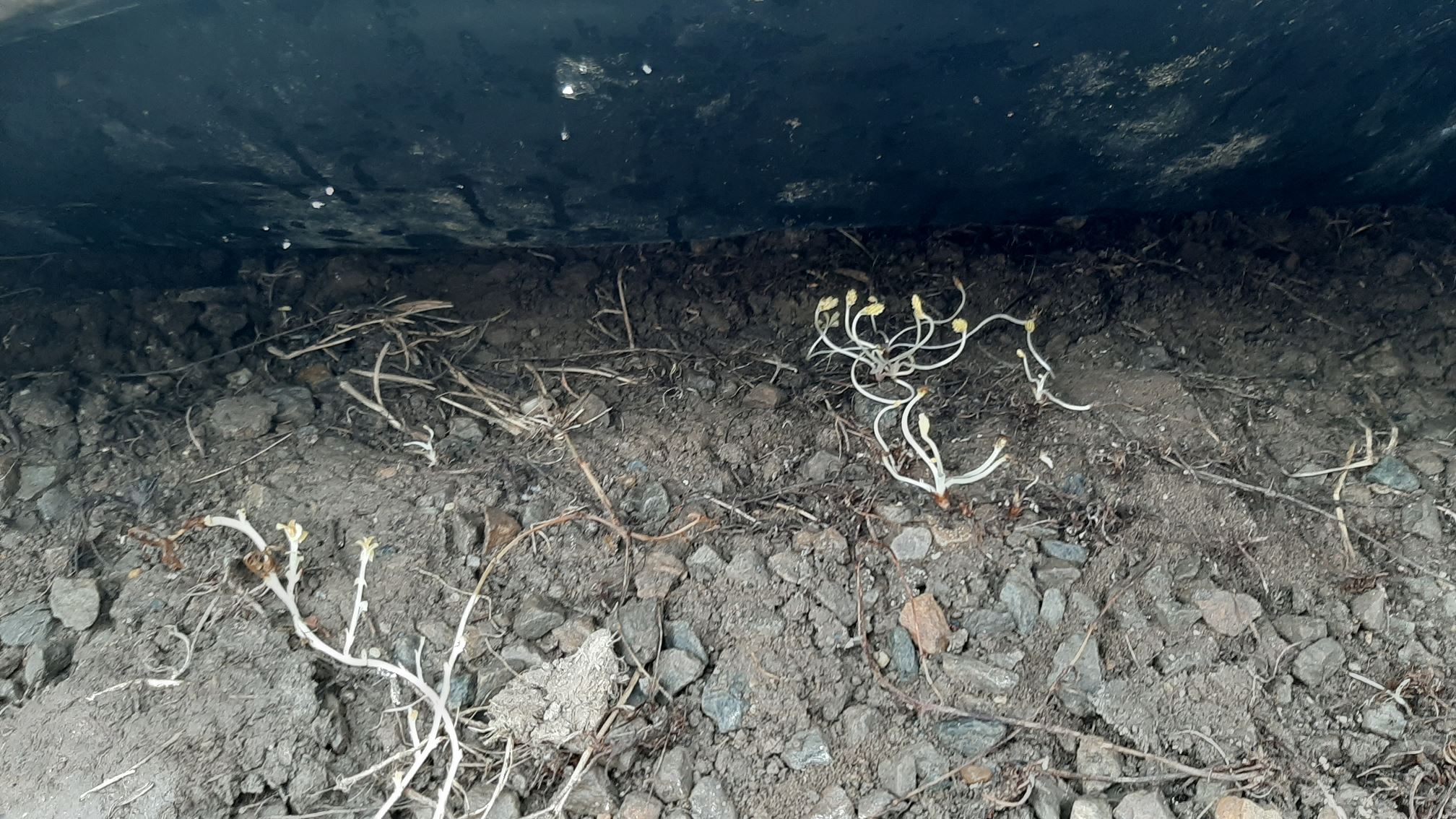 3 mois après, lorsque l'on jette un œil sous la bâche, nous n'y trouvons presque plus rien, sauf ces plantes-ci. Pousses très blanche sans lumière qui deviennent verte à la lumière et rampent plus ou moins où elles le peuvent.