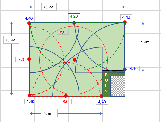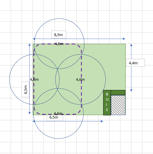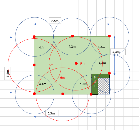 Après vous placez deux tuyères 3 mètres de rayon en 180 ° au milieu des côtés qui font 6,50 m (vous en avez deux) puis une tuyère 180° à 4,20 m sur le coté qui fait 8,50m.