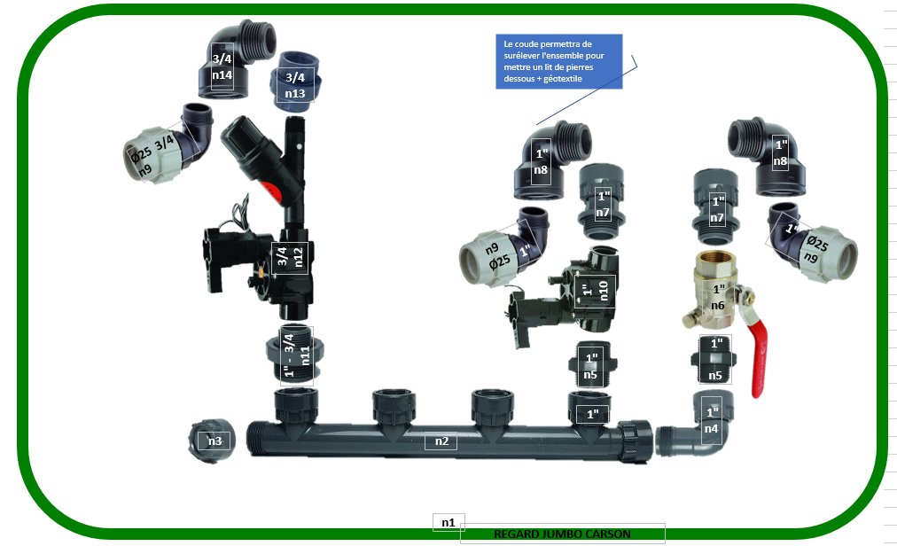J'ai utilisé des coudes (n°8 et n°14) après les raccords union pour surélever légèrement l'ensemble, cela me permettra de mettre un lit de pierre + géotextile.