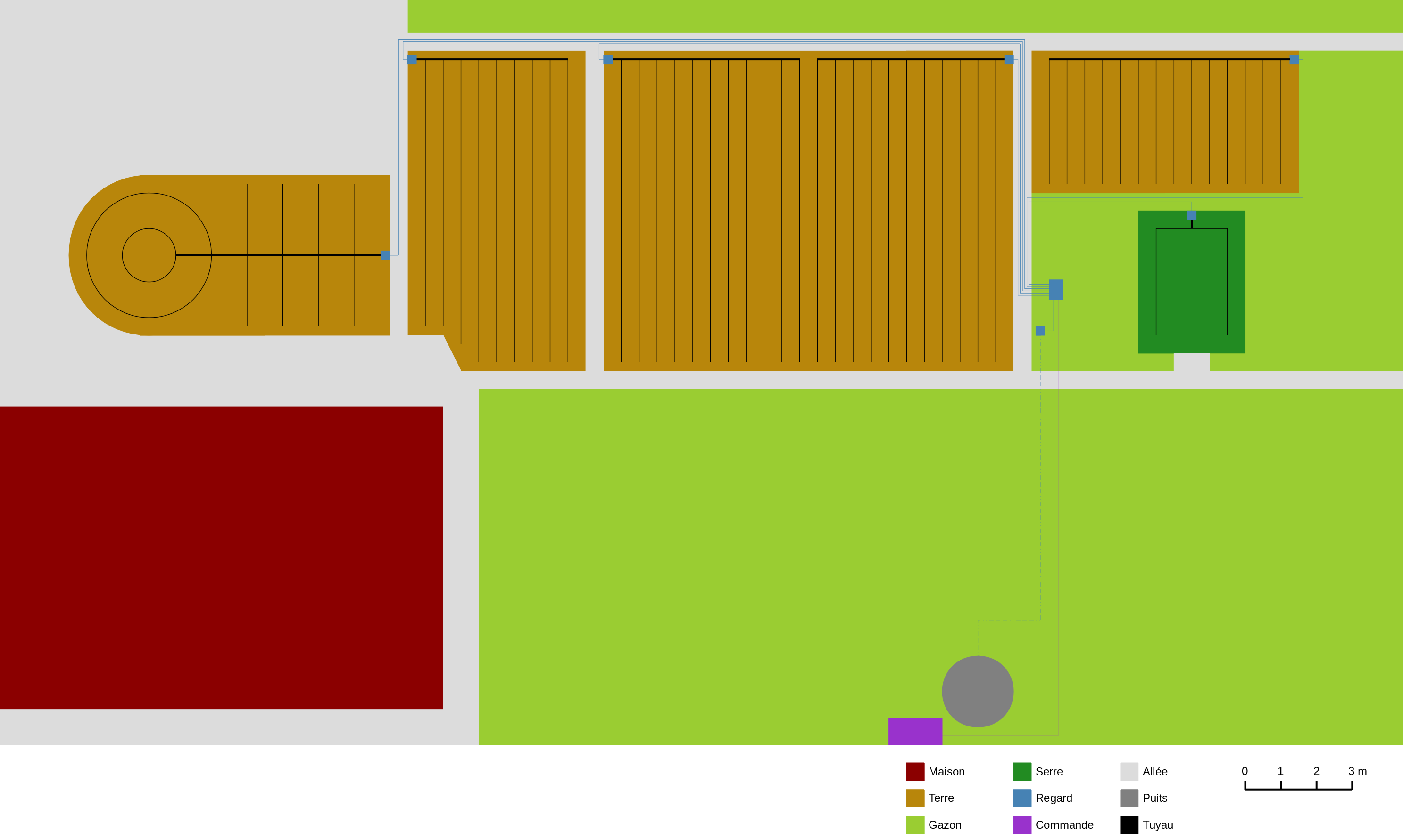 Afin d'appuyer mon message, j'ai pris le temps de faire un schéma de mon projet avec la version en "parallèle" et en "série". On peut y voir le massif de fleurs tout à gauche, puis le potager divisé en 4, et enfin la serre à droite :