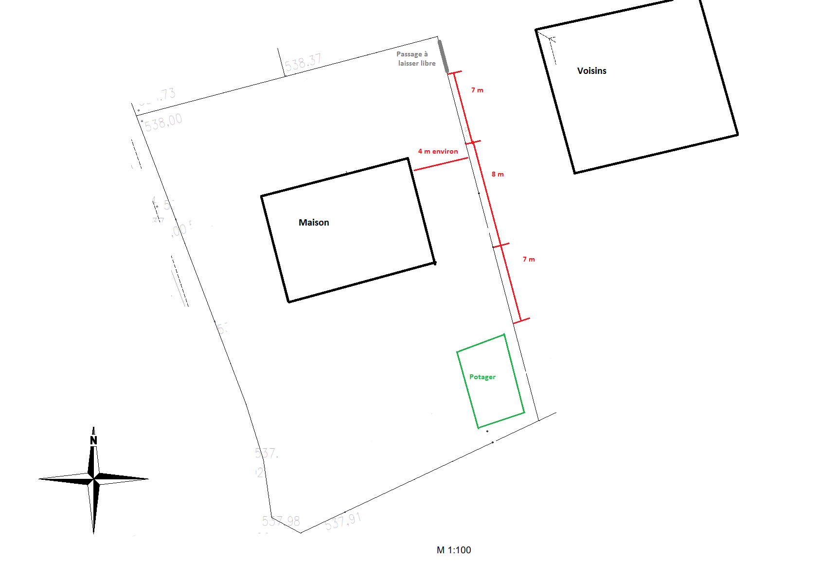 L'emplacement est orienté Est, à environ 4 m de la maison et fait environ 22 m de long.