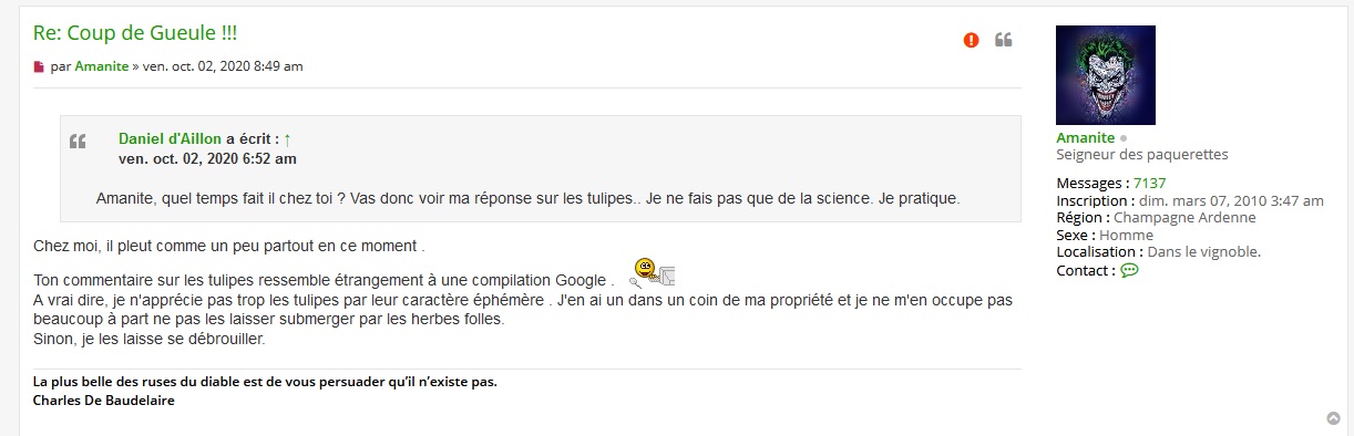Je suis franc et direct. Je dis ce que je pense, ce qui m'a valu pas mal de problème dans mon parcours professionnel. Je n'aime pas Amanite et je le dis. Je ne le respecte même pas, puisqu'il n'a aucune activité sur ce forum à part ses deux sujets de prédilection. Le jour où il commencera à s'intéresser au jardinage, le but de ce forum, peut-être que je changerai d'avis. Te concernant, je n'ai aucune hostilité, bien que nous ayons des points de vue différentancolie03 a écrit : sam. 03 oct. 2020 13:23 amanite ne me derange pas plus que d'autres ,toi aussi t'es rarement sympa