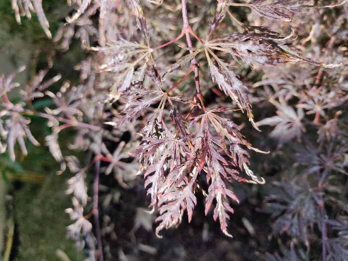 J'ai planté en Avril dernier un Erable du japon (crimson queen) , dans un trou 3 fois la taille de la motte avec un mélange de terre de bruyere/terre du jardin et un lit de billes d'argiles. Il se portait bien (en dehors de quelques pointes de feuilles sèches) jusqu'au nombreuses averses ses dernières semaines, oú des tâches blanches ont commencés a apparaitre. J'ai pulvérisé un mélange de purin de préle et orties sur le feuillage mais je n'ai pas l'impression que se soit mieux (pas pire non plus).