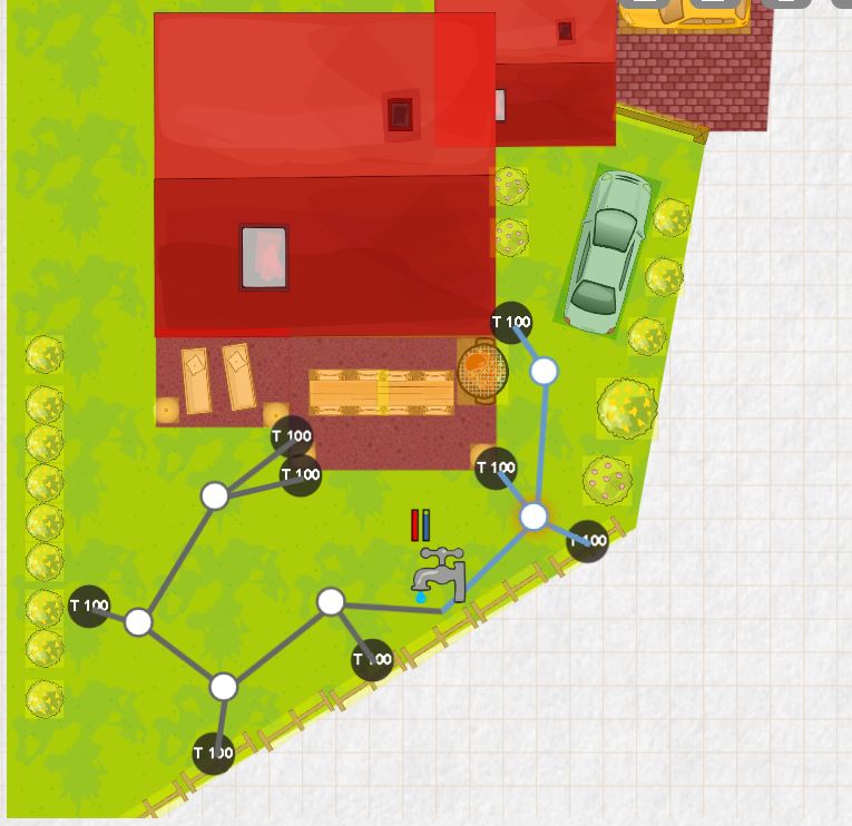 Voici l'implantation de notre maison sur notre petit terrain : Voici ce que me donne la simulation Gardena après "simplification" : Nous avons utilisé le site de Gardena pour réaliser une simulation, mais celui-ci nous propose énormément (trop ?) de matériel à acheter.