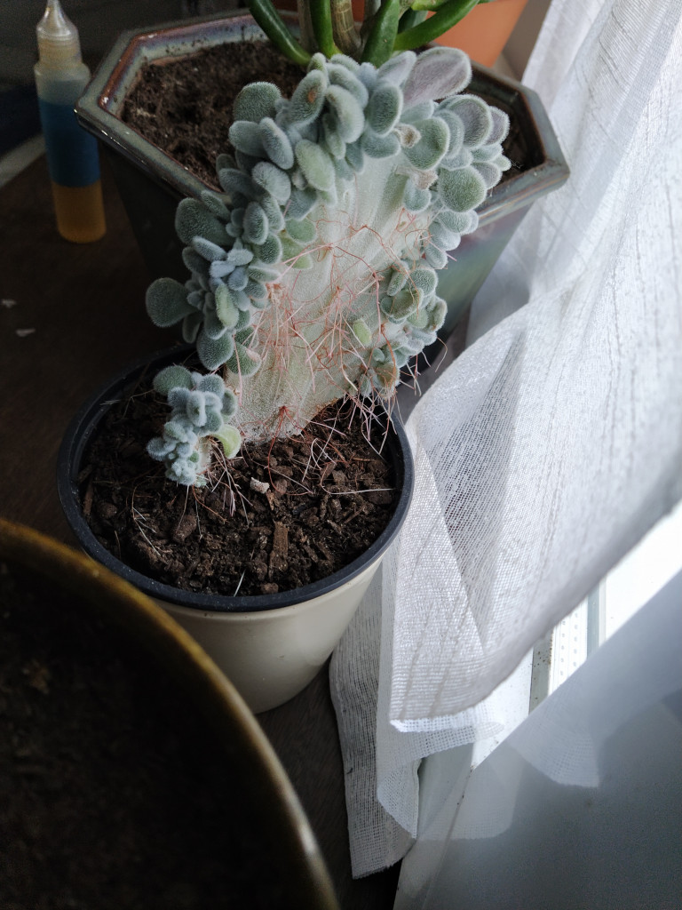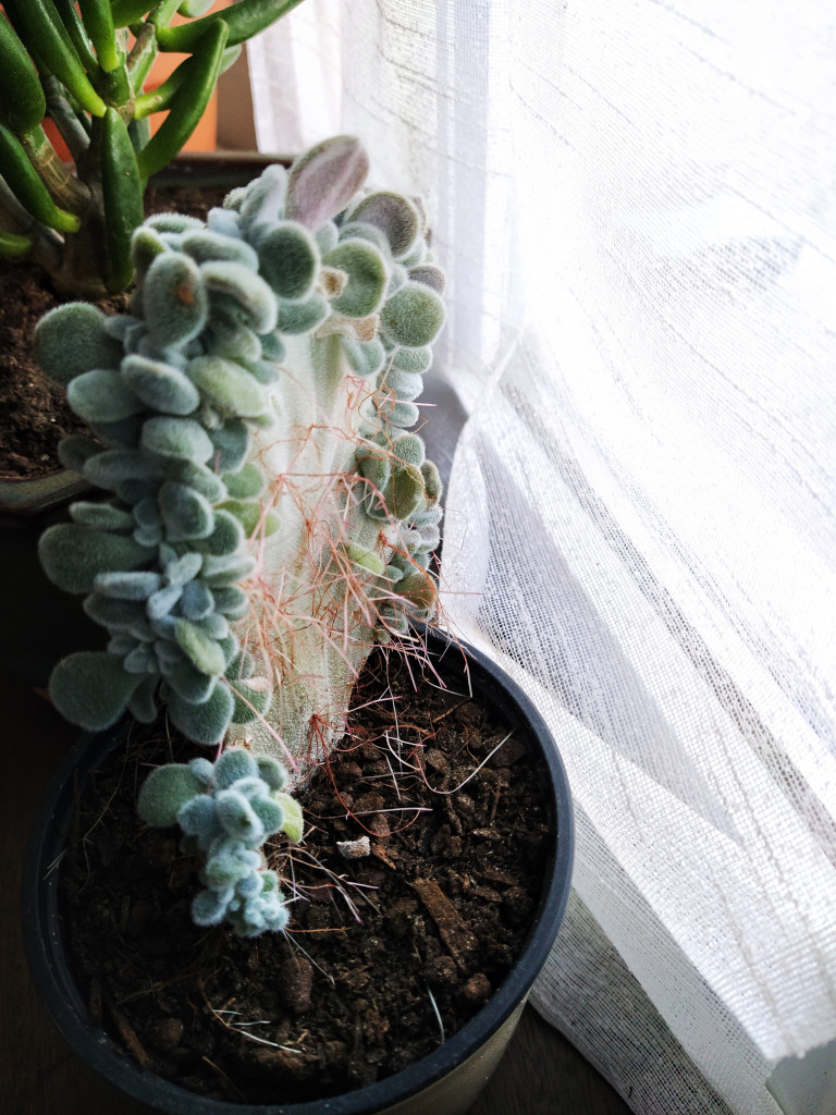 Cet echeveria pulvinata frosty cohabite depuis quelques mois chez moi. De plus en plus de racines font leur apparition le long de ses tiges, j'aimerais comprendre pourquoi. Pour info, quand il s'agit de l'arroser, je le bassine -j'espère bien faire?- et il est placé devant une fenêtre exposée sud (enfin un sud finistérien..).
