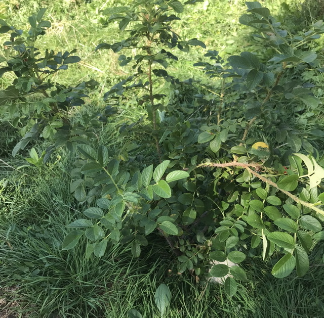 ( Accessoirement, à tout hasard si un lecteur de passage connais le Rosa rugosa... : celui qui pousse très bien a des fleurs blanches ; j’ai pourtant commandé des Rosa rugosa à fleurs roses sur un site, mais surtout, pour ce que j’ai cherché sur Internet il n’existe pas de Rosa rugosa blanc. Pourtant les feuilles sont bien les mêmes, et là il y a une première petite boule rouge typique du rugosa en automne.