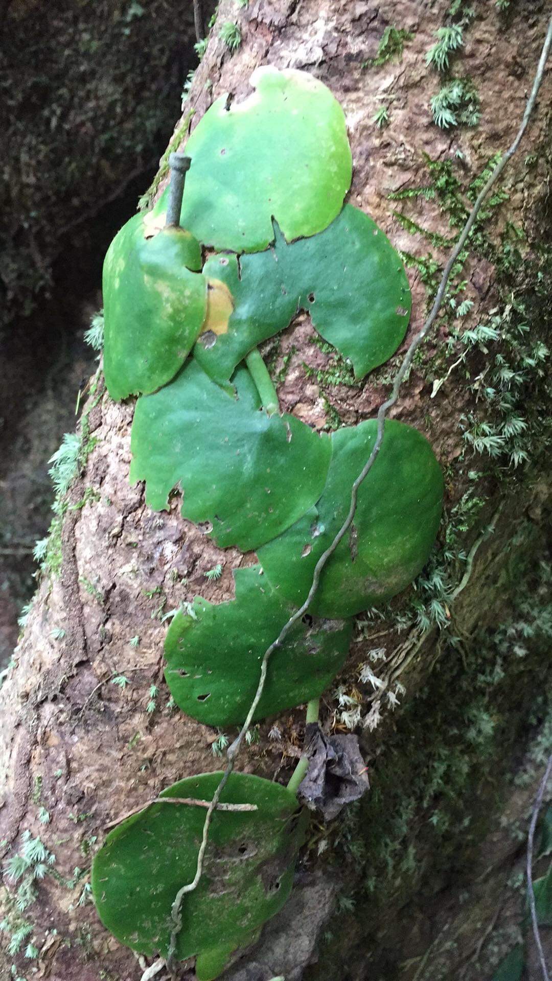 Habituellement les Raphidophora, Monstera, Epipremnum/Scindapsus, etc... qui poussent plaqués à un support sont bien symétriques. Là ça ne semble pas être le cas... Les feuilles sont rudement abimées mais on dirait qu'elles sont bien rondes. Ca me fait penser à un Hoya (Hoya imbricata) mais je n'ai aucune idée de sa présence (ou pas) en Guyane !