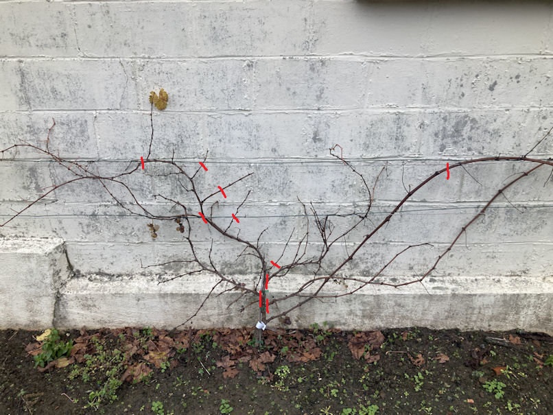 C'est pas mal bien que l'idéal pour la vigne c'est l'orientation sud-est ... A votre place, je ferais un double cordon en sélectionnant dès à présent les deux plus belles branches, laissez-leur 50 cm minimum de chaque coté et fixez-les sur un fil. Le mur vous permet de fixer facilement tout ce que vous voulez. Je ne suis pas un pro mais je taillerais ainsi ...