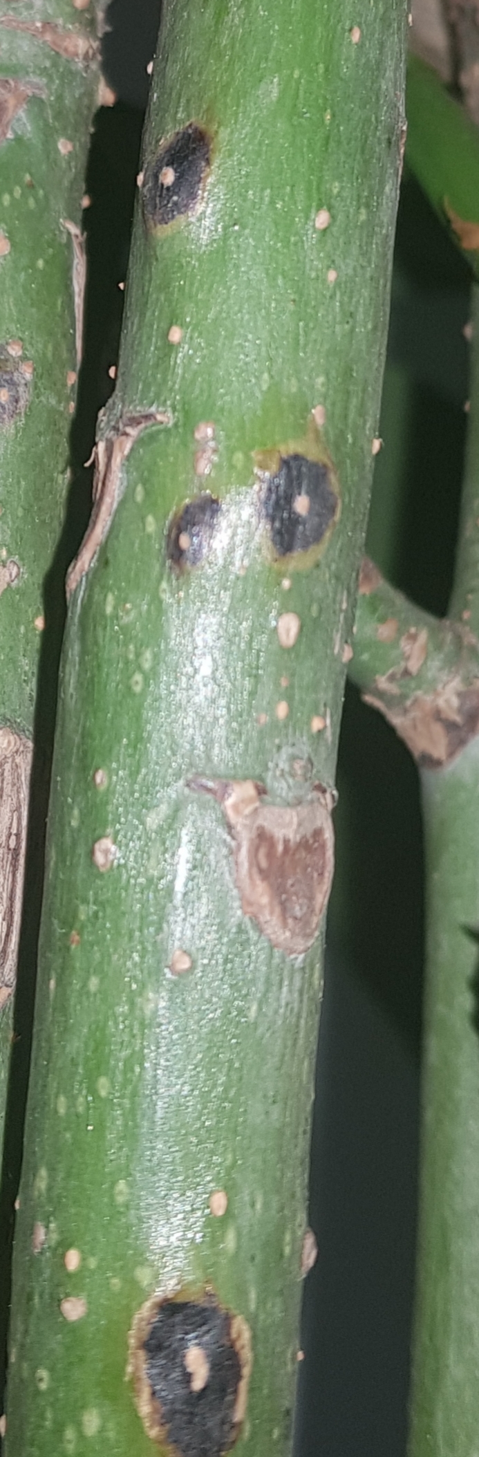En tout cas je ne vois pas de cochenilles sur les deux autres photos, ni de traces de leurs dégâts. Les coulées collantes pourraient faire penser à leur miellat mais avec autant tu aurais du voir des cochenilles en quantité. Je pencherais à des échappées de sève, il est possible que ton Pachira soit trop arrosé. En hiver ils boivent moins donc il faut arroser moins.