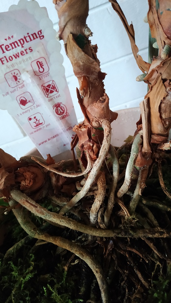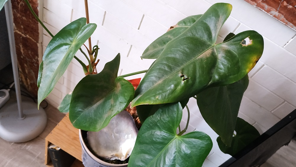 L'Anthurium souffre un peu de sécheresse ambiante. Il lui faudrait un rempotage et une coupelle de cailloux sous le pot avec de l'eau à mi hauteur.