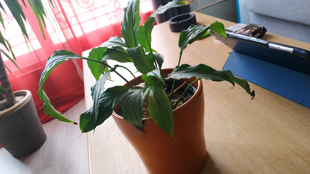 Le Spathiphyllum manque d'eau aussi et un peu de la sécheresse de l'air. On voit que ses feuilles ondulent un peu. Comme l'anthurium, une coupelle de cailloux avec de l'eau à mi hauteur sous le pot, le dessous ne doit pas être en contact avec l'eau.