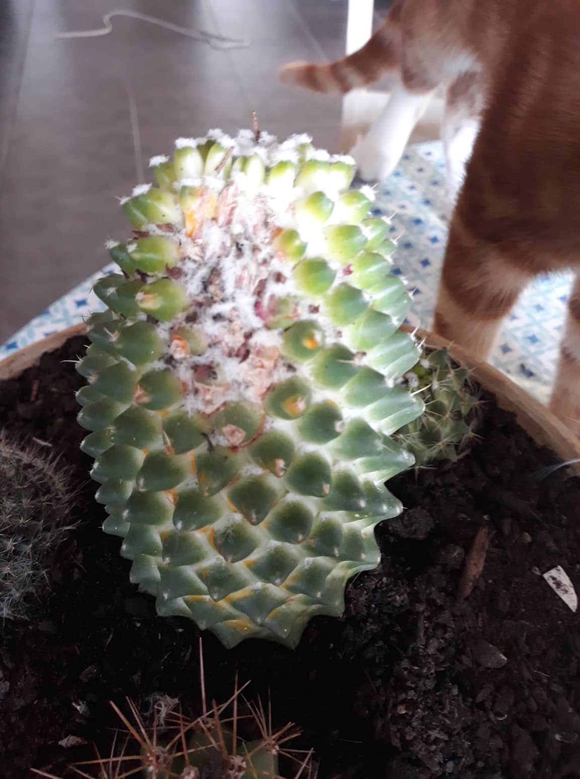 Ils sont au nombre de 4, tous plantés dans le même pot et je ne connais pas leurs espèces. Pour ce qu'il en est de leurs maux, le plus grand a reçu un choc (mon chat l'a fait tomber) depuis il y a une partie qui a commencé à pourrir à l'endroit de l'impact et le cactus est devenu jaune sur certaines zones. Une "mousse blanche" est également apparue sur ce dernier ainsi que sur deux des petits (notamment celui aux grandes épines). Le pot est quand à lui infesté d'insectes qui ressemblent à des moucherons. Si je dois traiter le pot et la terre, quel répulsif me conseillez-vous?