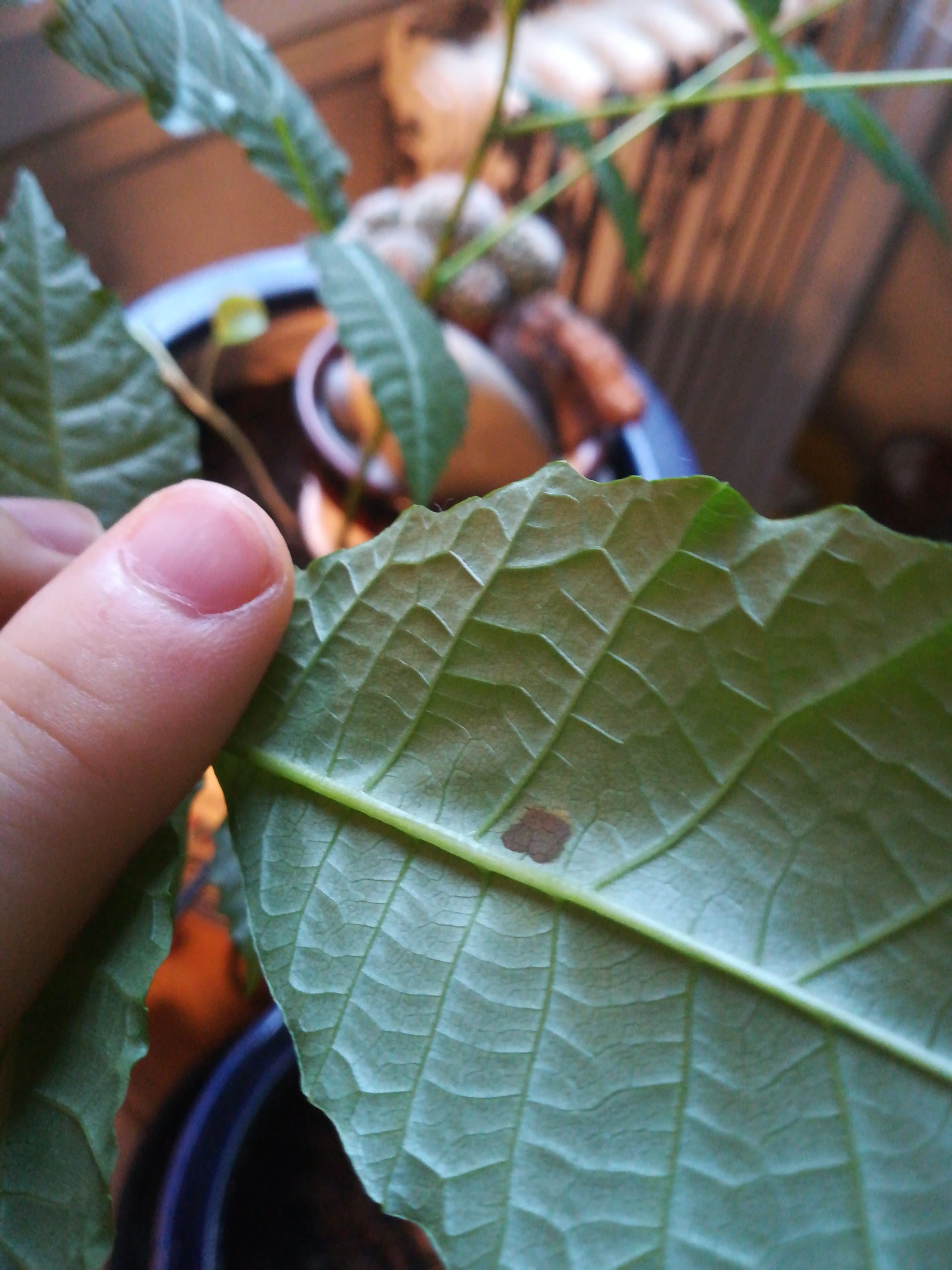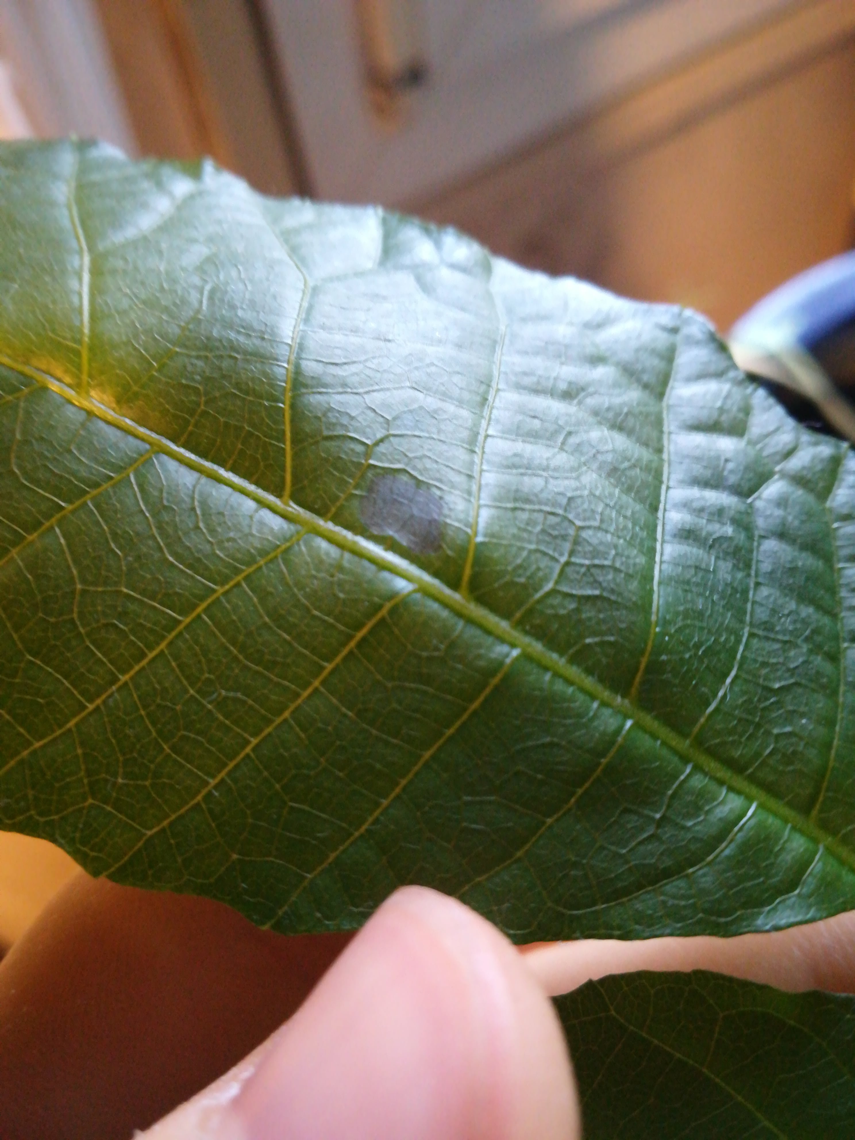 Alors voui il est exposé derrière une fenêtre exposée plein sud, en Île de France. La situation s'est dégradée avec une autre feuille tachée à plusieurs endroits et une petite plaie sur une tige. J'ai pensé au chancre ou à un champignon du noyer. Le fond du pot est rempli de brisures de coques de noix pour que l'eau puisse filtrer (je n'avais plus de billes d'argile, j'ai trouvé l'astuce sur internet). Certaines coques étaient peut-être champignonnées, ou la noix dont il provient l'était. Je soupçonne aussi un excès d'arrosage, mais j'éponge généralement l'excédent d'eau... Je vais le laisser s'assécher quelques temps au cas où.