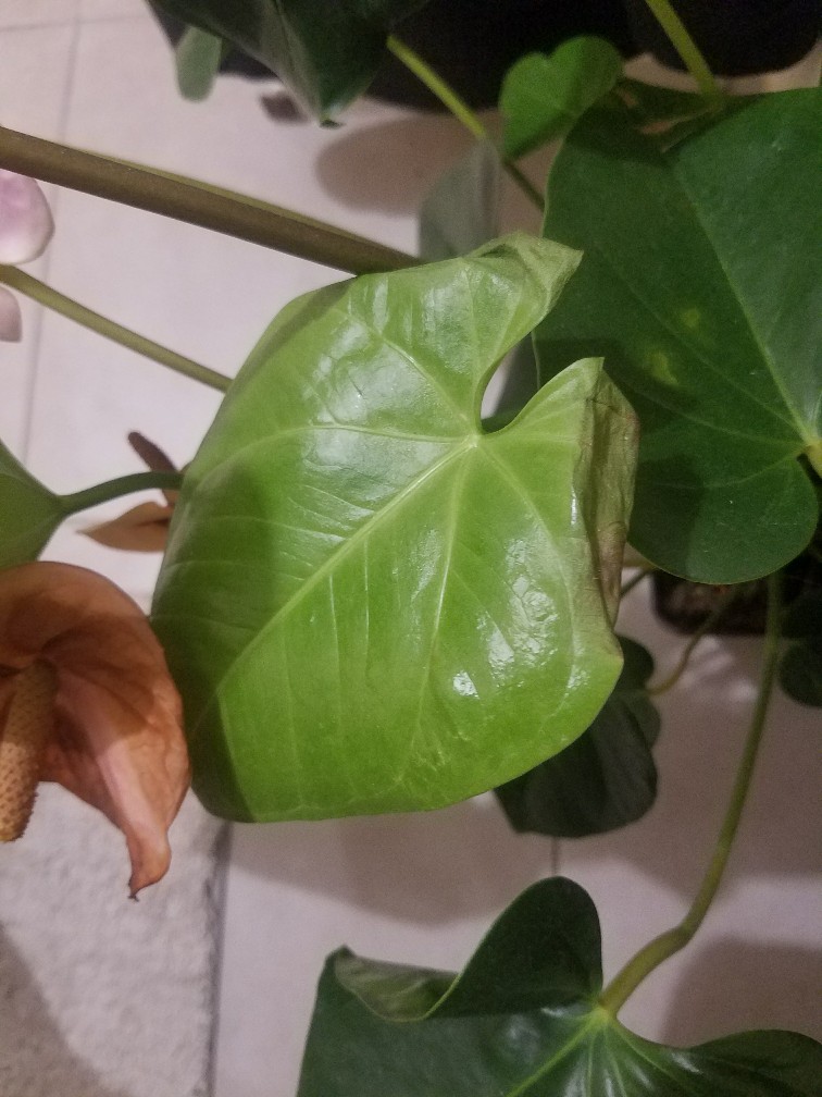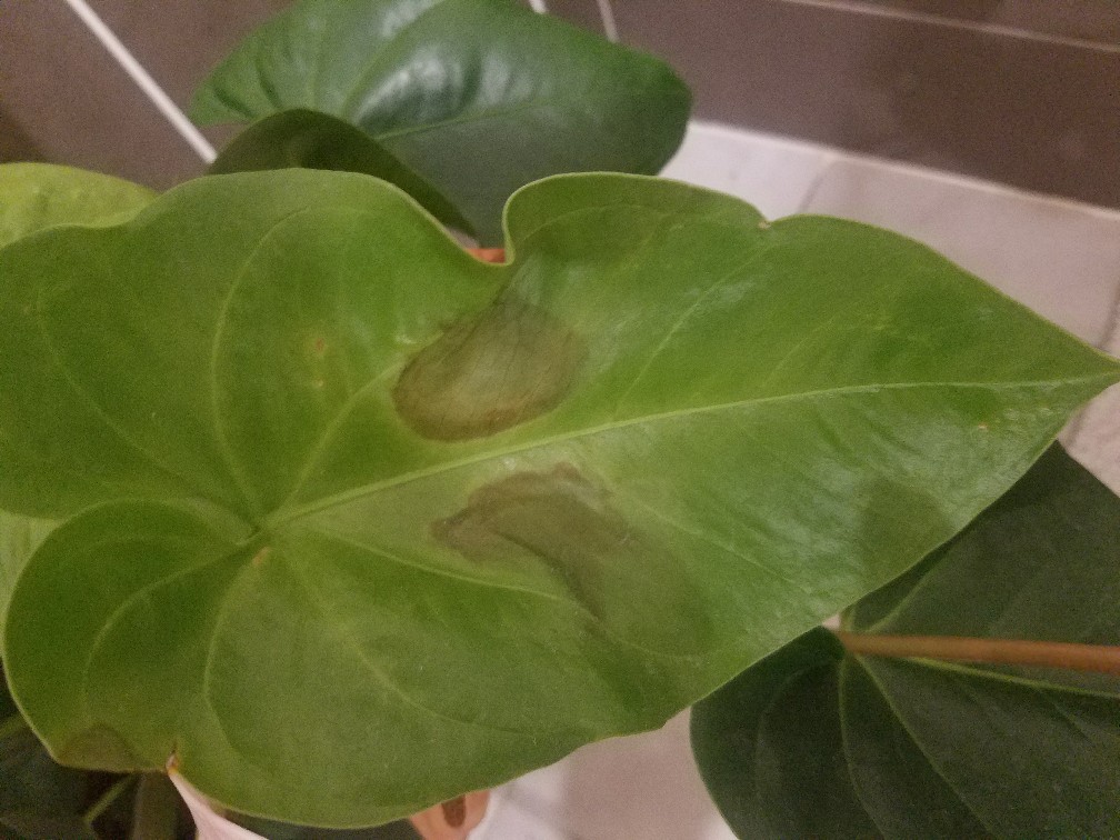 J'ai récemment eu un anthurium et je l'ai installé dans la salle de bain. Il a fait pas mal de nouvelles feuilles mais quelques unes qui sont anciennes ont des taches ainsi qu'une fleur. Savez vous ce que ca peut etre et est ce que je dois enlever la partie touchée ?