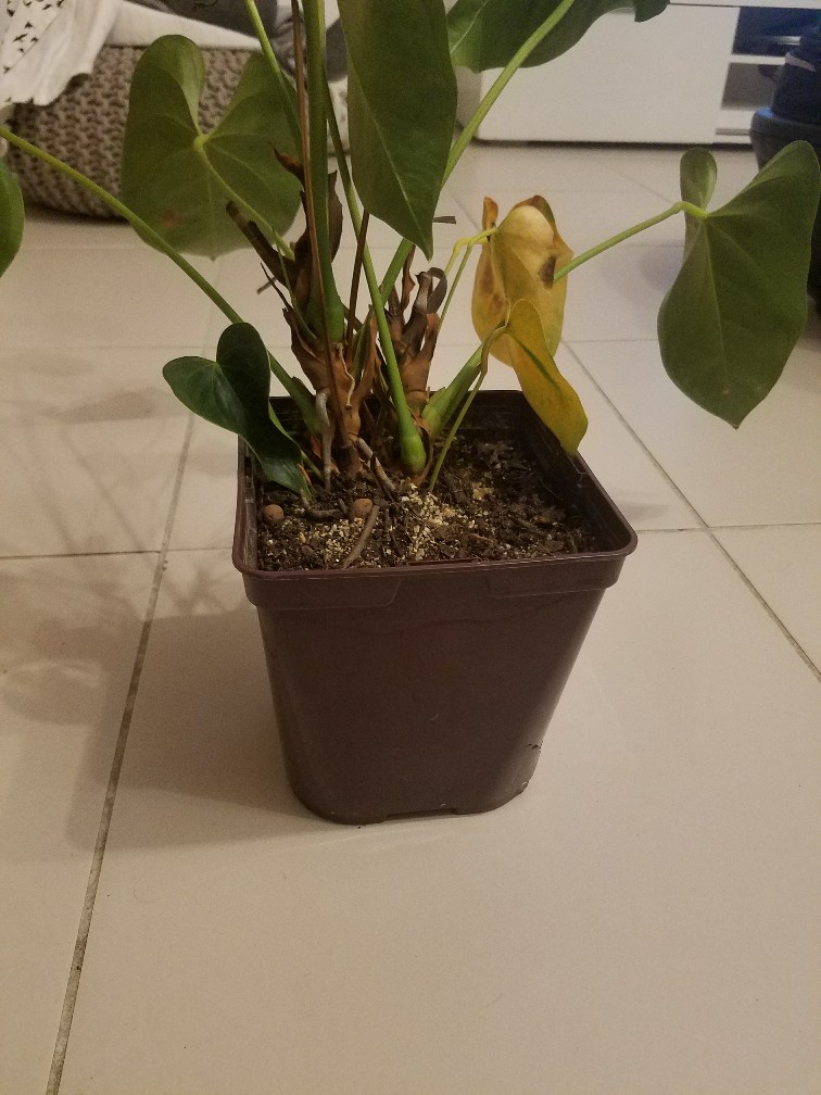 Quand le jaunissement se généralise c'est quasiment toujours qu'on a trop arrosé : moins de luminosité = plante qui boit moins = noyade si on continue d'arroser comme en été. Ce n'est pas le cas pour cet Anthurium.