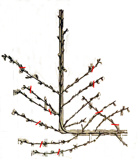 Sur mon calendrier potager de Gamm vert de cette année, il y a des dessins des différentes formes des arbres fruitiers. J’ai reproduit la palmette simple en U. Ce sont des arbres de petite taille que l’on installe le long d’un mur ensoleillé. Bien conduit c’est très agréable à regarder.